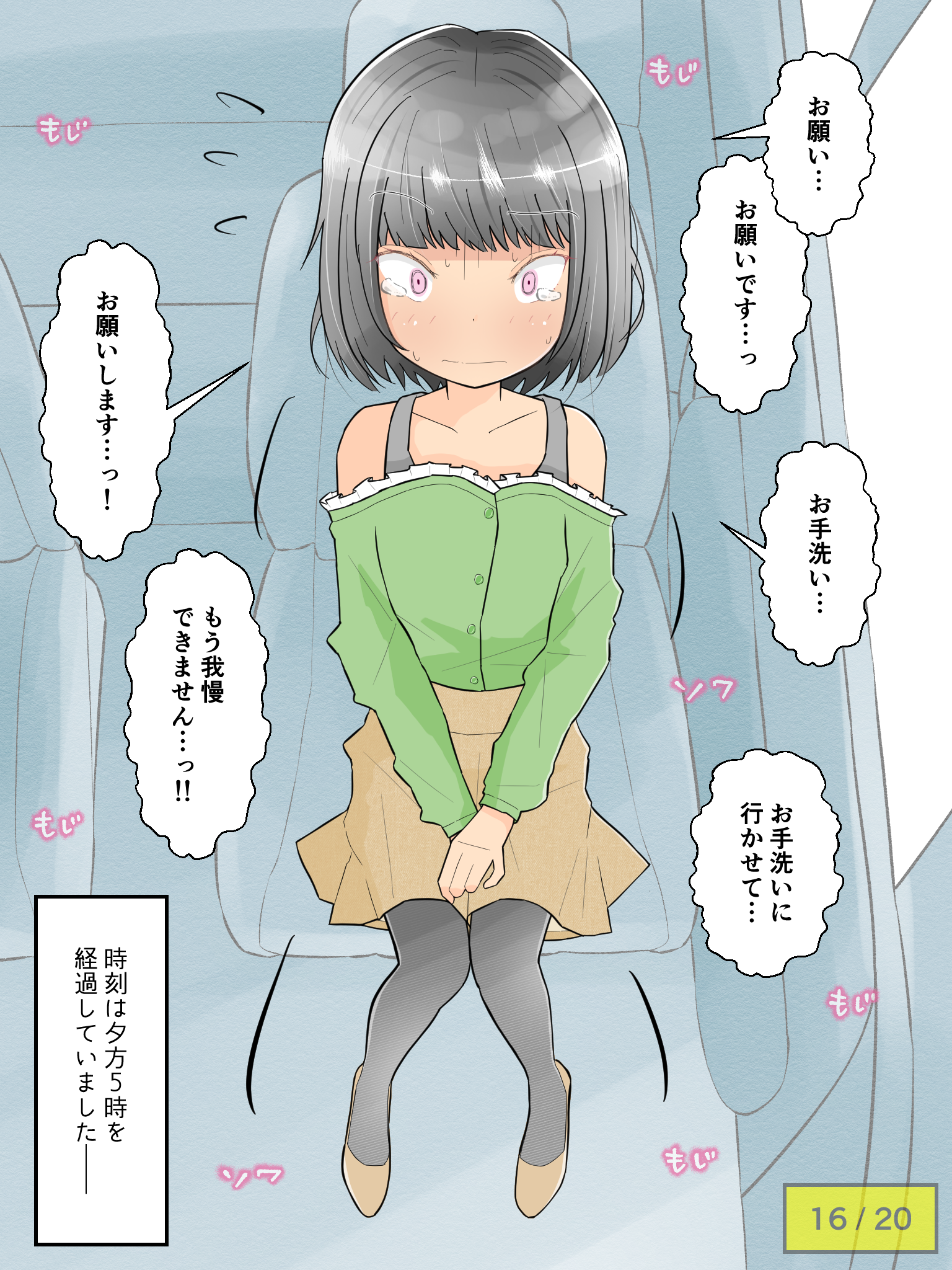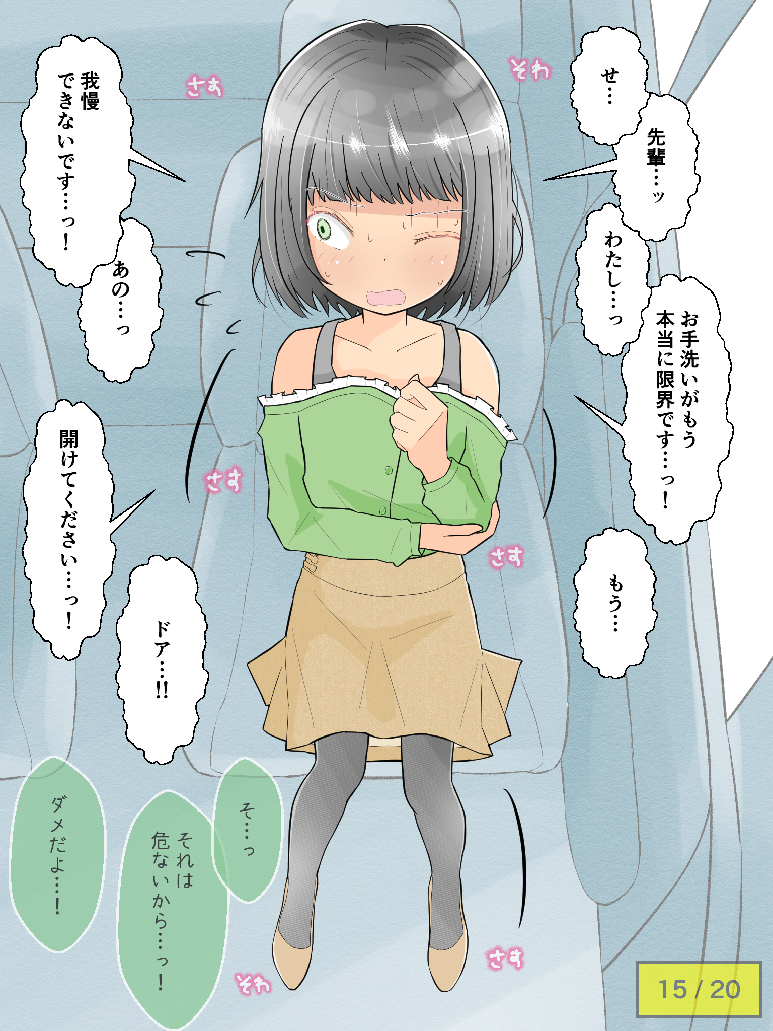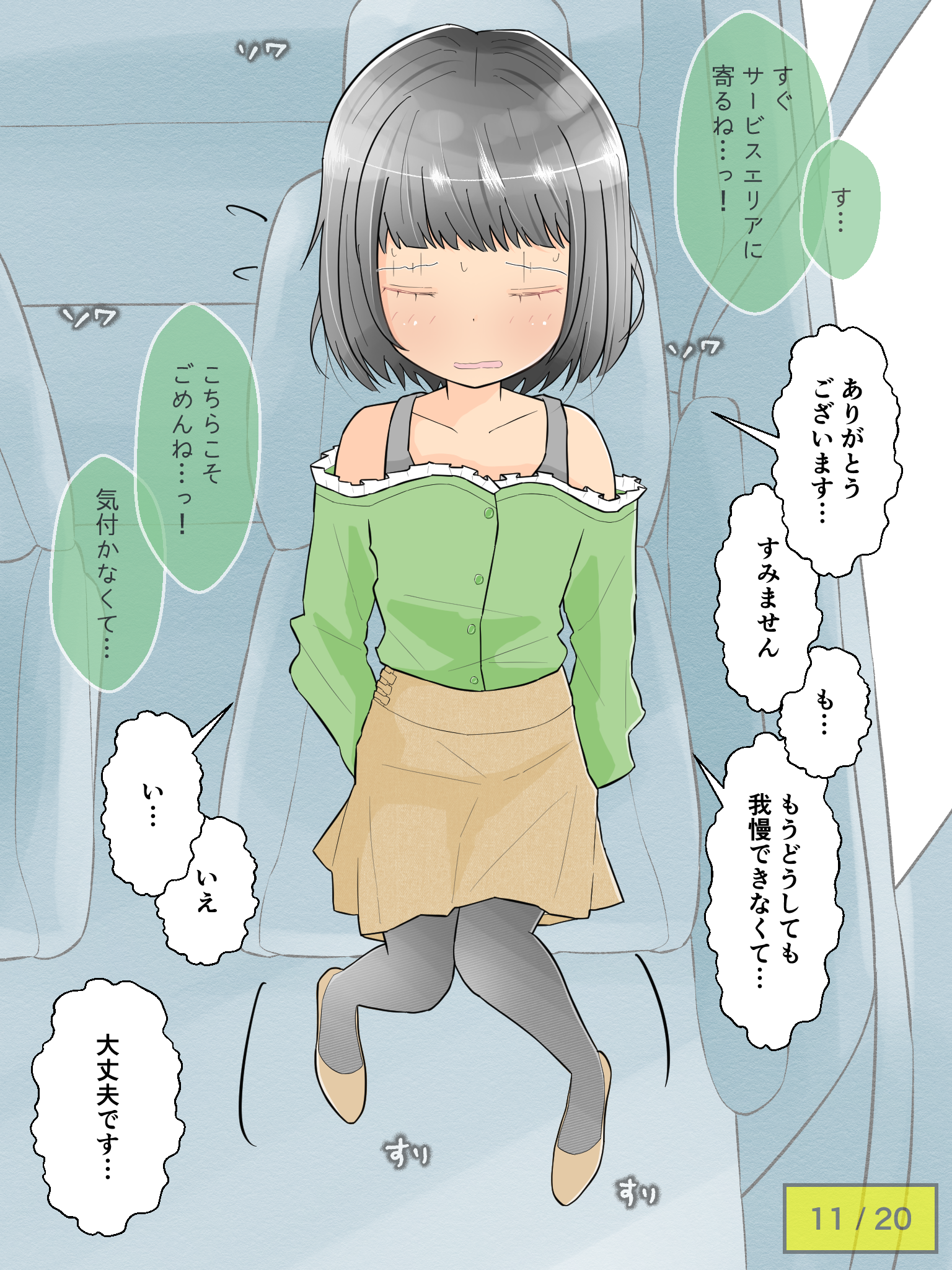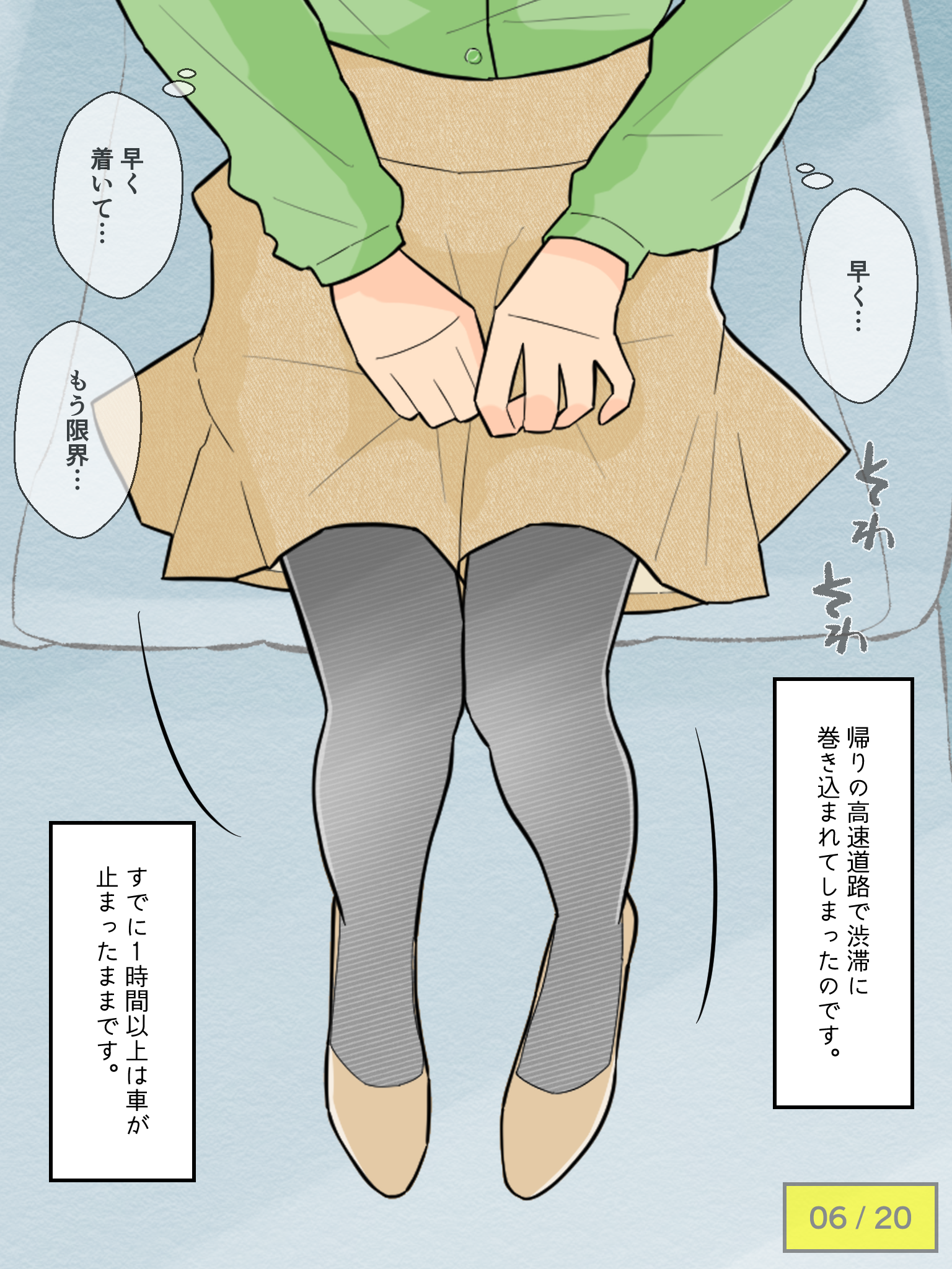 先輩の車でドライブを楽しむも、気恥ずかしさからずっとトイレを我慢し続けてしまう彼女。