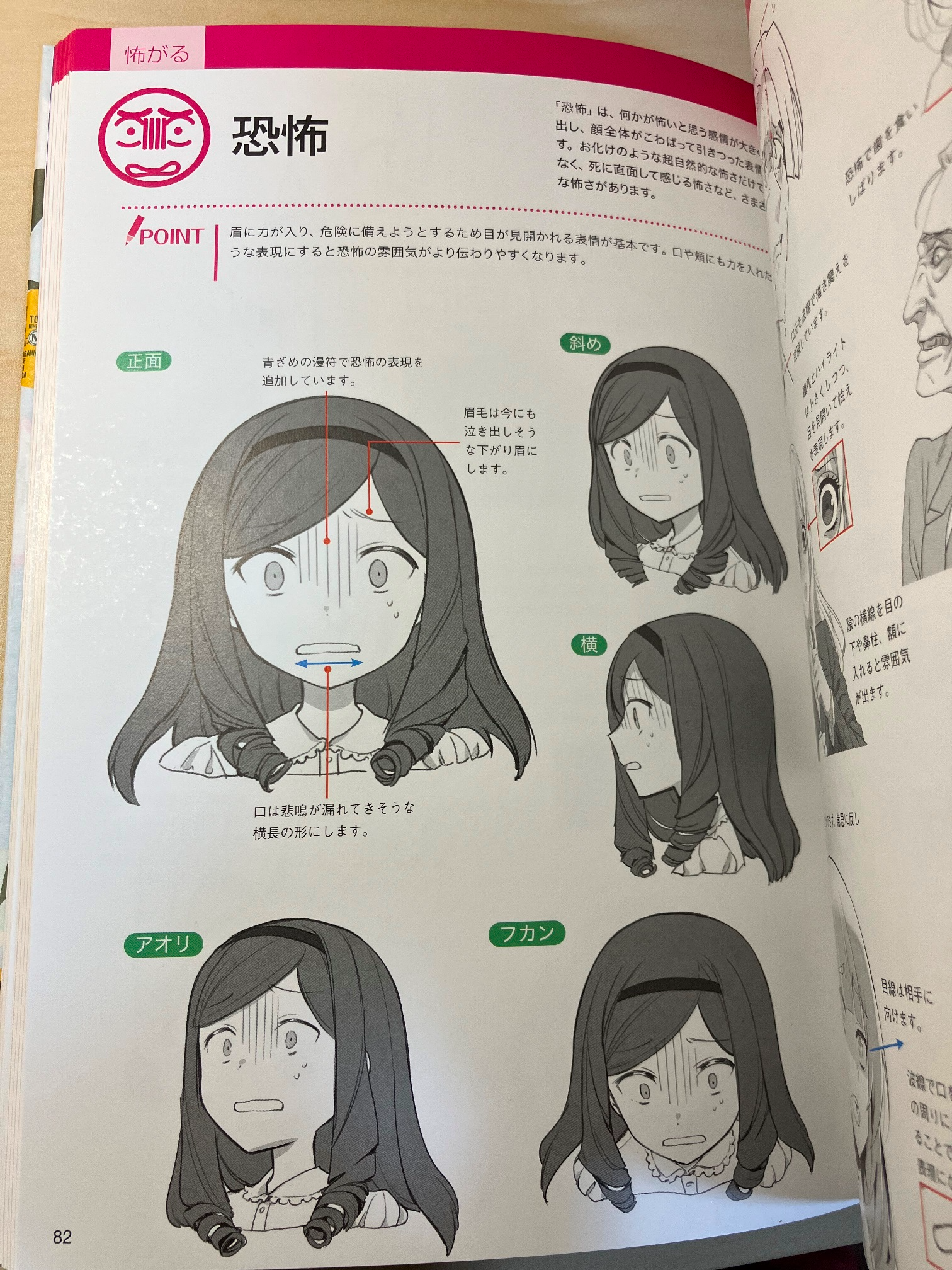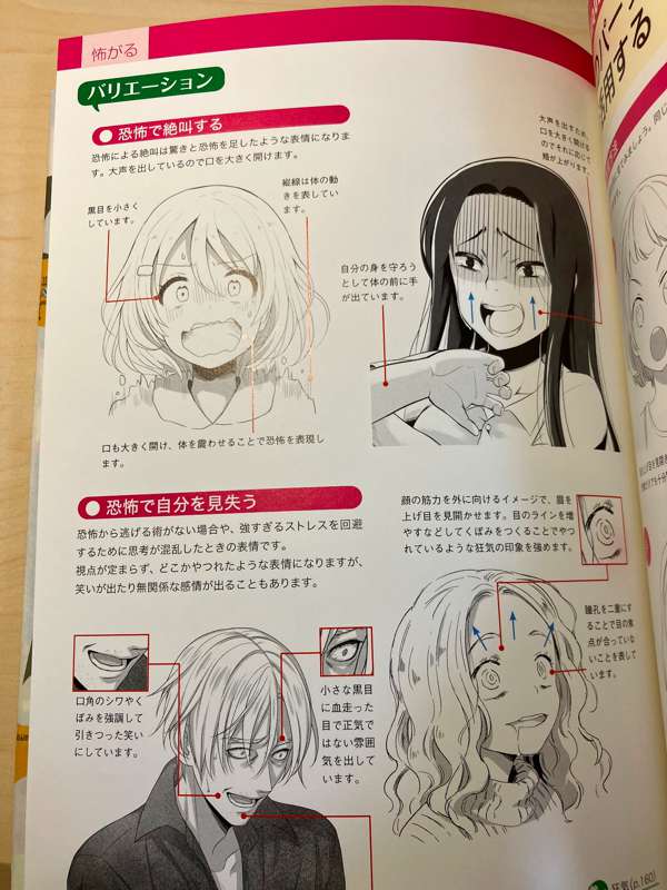 「怖がる」表情の描き方を指南するページなのですが、女性の怯えた表情に強い性的興奮を覚えてしまう私にとって、このページは何度も何度も読み返してしまいました。