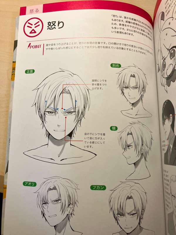 このように、喜びや悲しみの表情、怒りの表情…等々、「表情」に関するあらゆるバリエーションを指南するイラスト教本です。