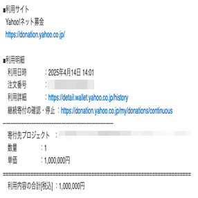 寄付先はいくつか調べて信頼できる団体を探し、今世界で最も支援が必要な地域に向けた活動をしているNPO法人を選びました。以下が受領時のメールになりますが、必要であれば後日送られてくる領収書も添付します。