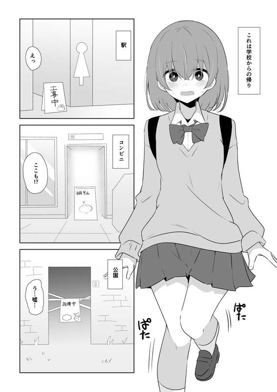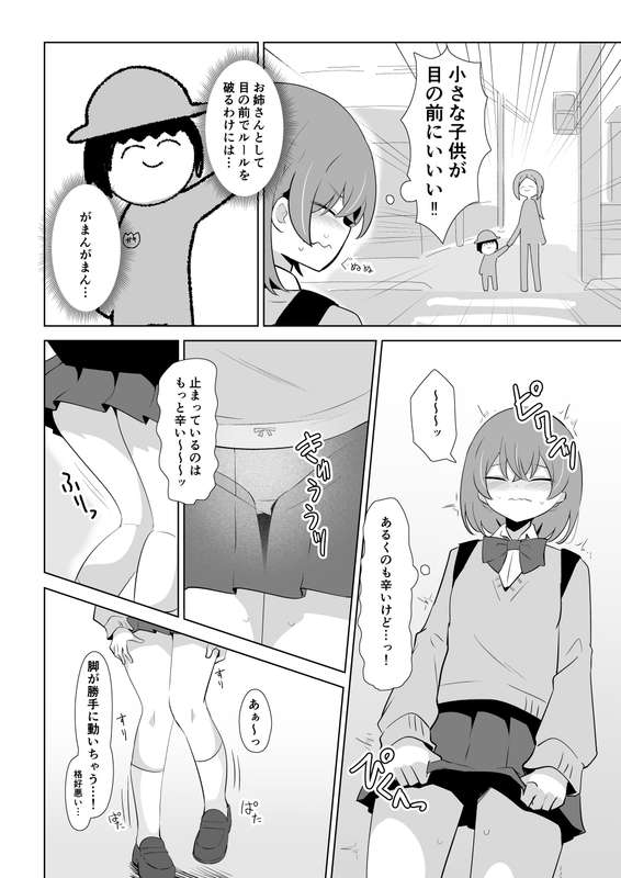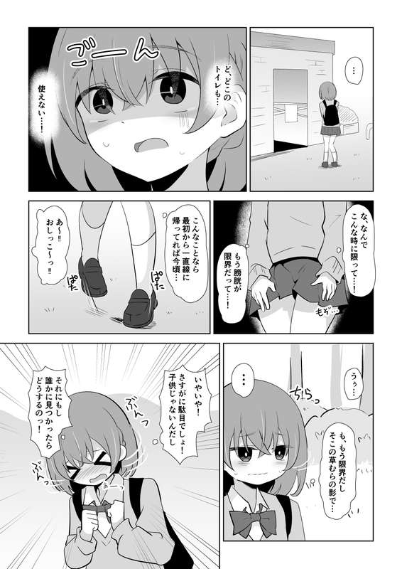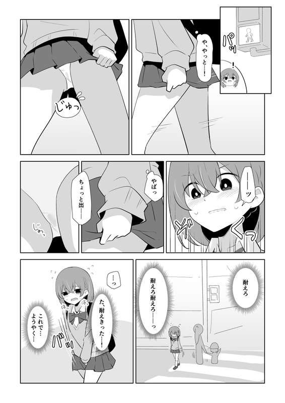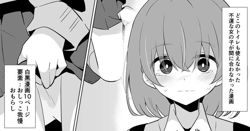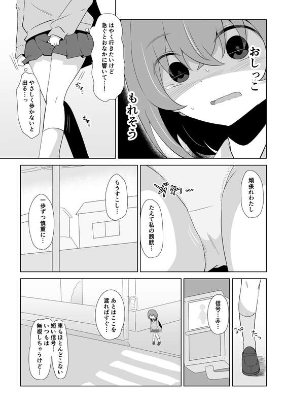 閲覧ありがとうございました。 久々?に白黒漫画でした。 苦手なところを描いたりはしてませんが、なんとか10Pかけました。 もともと数ページの予定だったけどボリュームが多くなることは良い事なのでよい事です。 やっとトイレ...という場面でおあずけになってしまって 心が折れたようにおもらししてしまうのはかわいい。 という絵でした。 横断歩道のページの最初の2コマ描くのたのしかった。 そんなかんじでした。 ありがとうございました