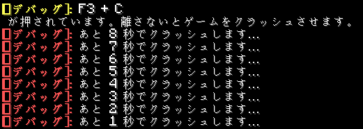 F3+Cを押している時にチャットに表示されるクラッシュ警告のスクリーンショット。