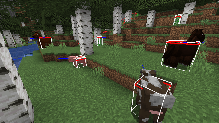- F3 + B : エンティティの当たり判定を表示/非表示にする。また、エンティティが見ている方向やエンティティの視線の高さも表示される。エンティティの上に別のエンティティが騎乗している場合は、そのエンティティとの接続点が黄色く縁どられた四角柱として表示される。