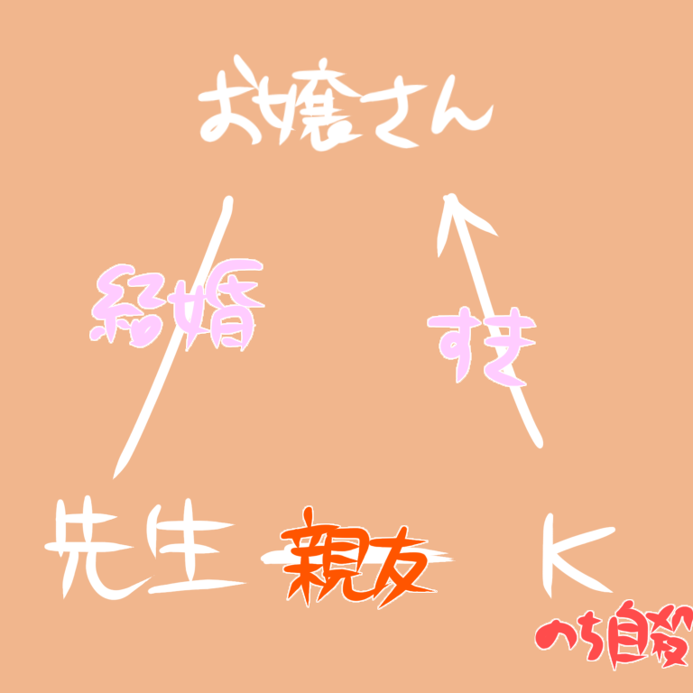 先生が手紙で告白した過去のエピソードには、親友のKと、先生の現在の妻であるお嬢さんとの三角関係が示されます。