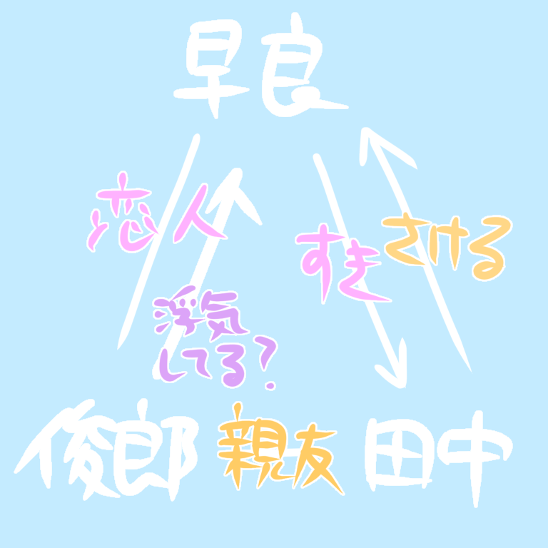 ちょっとわかりにくい言葉で当たり前のようなことを言っておりますが、つまり、三角関係において異性愛も見所ですが、同性の間のつながりが注目ポイントになるということです。同性間でしばしば友情という簡素な言葉では表せない関係が明るみになることがあります。
