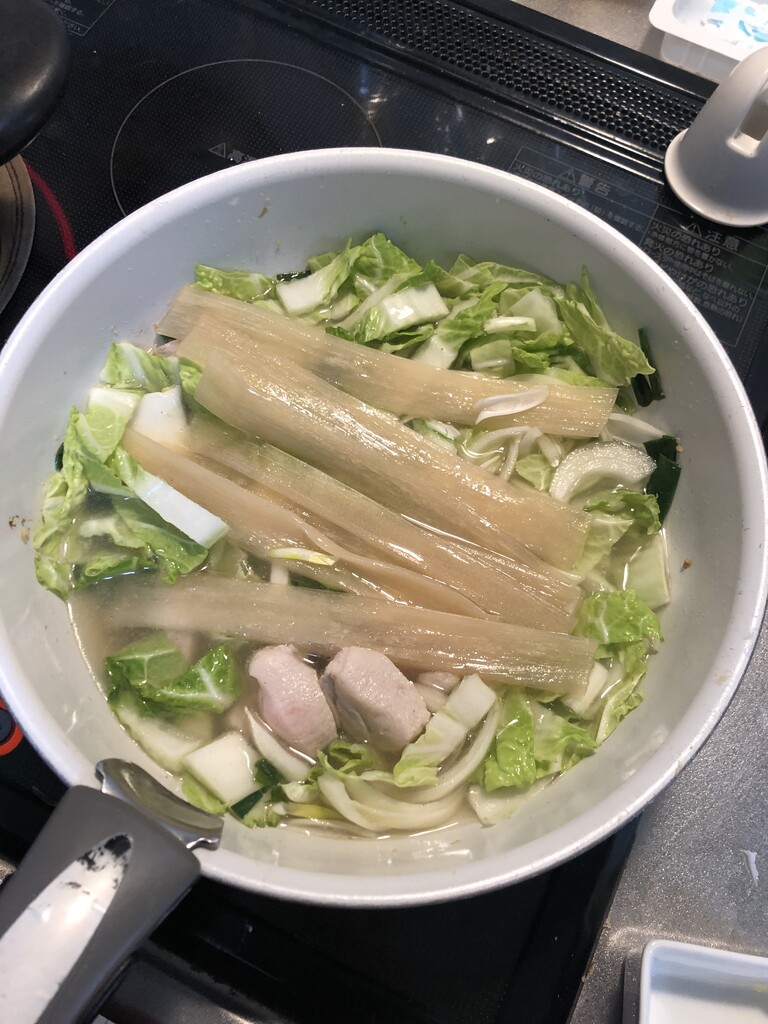 「猪肉炖粉条」の料理名に入ってる「炖」とは煮詰めるみたいな意味なんですが、めんどいので白菜、ネギ、玉葱全部ぶっこんで煮込みます。さっき下茹でした奴とは思えないショートカットです。料理名に背いてるので、これをもって別の料理になりました。