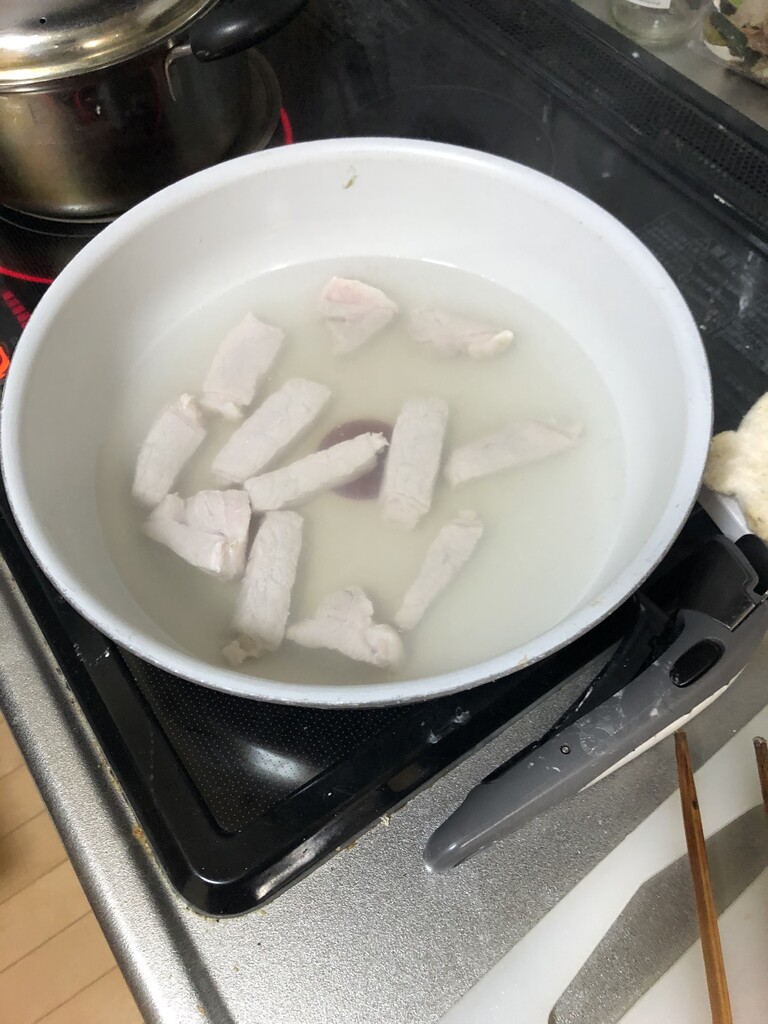 豚肉を下茹でします。