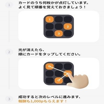点灯しているカードを覚えて順番通りに消すゲームです。最大1,000ポイントもらえます。