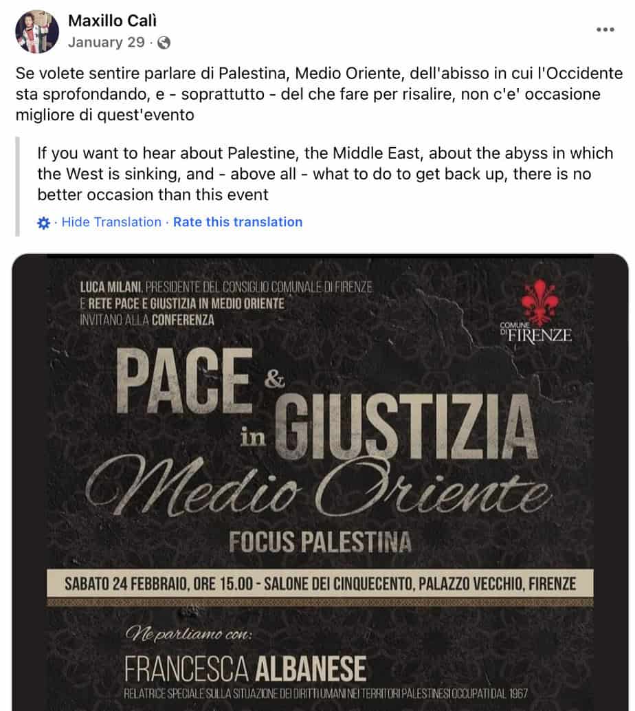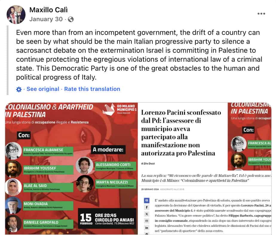 Cali promoted a panel with his wife Francesca Albanese titled “Colonialism and Apartheid in Palestine.” The text of the post accuses Israel of “committing extermination in Palestine.” He said that Italy’s Democratic Party is “one of the greatest obstacles to human and political progress of Italy.” (January 30, 2024).