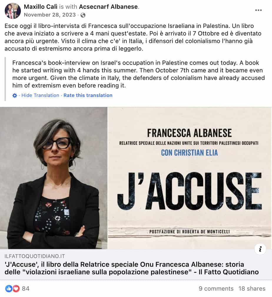 Cali promoted his wife Francesca Albanese’s antisemitic book “J’Accuse” which accuses Israel of “apartheid and neocolonial occupation.” The book’s title, “J’Accuse,” deliberately inverts the historic title of Emile Zola’s manifesto denouncing antisemitism in Dreyfus affair and turns it against Israel as the Jewish State. (November 28, 2023).