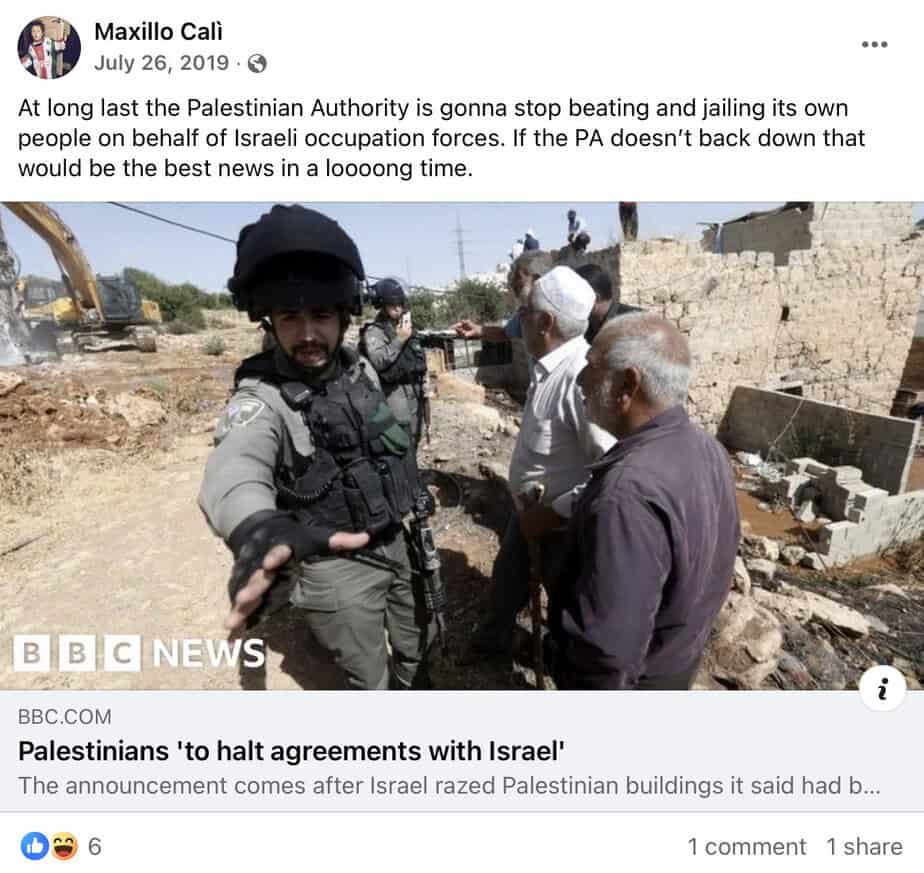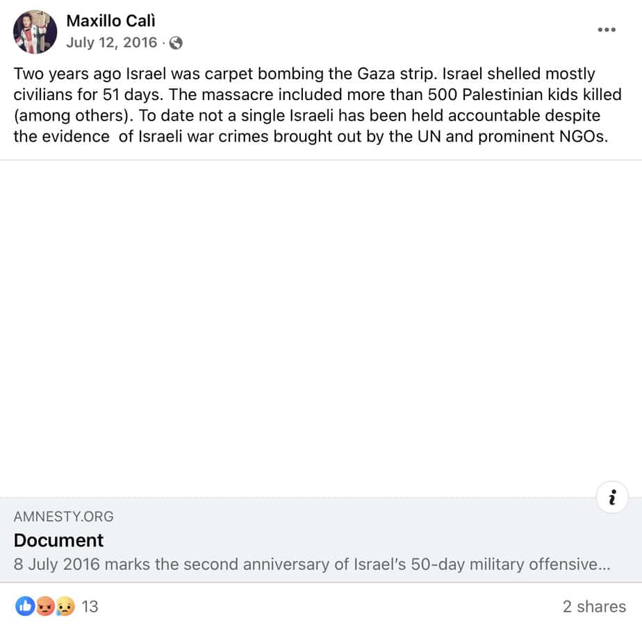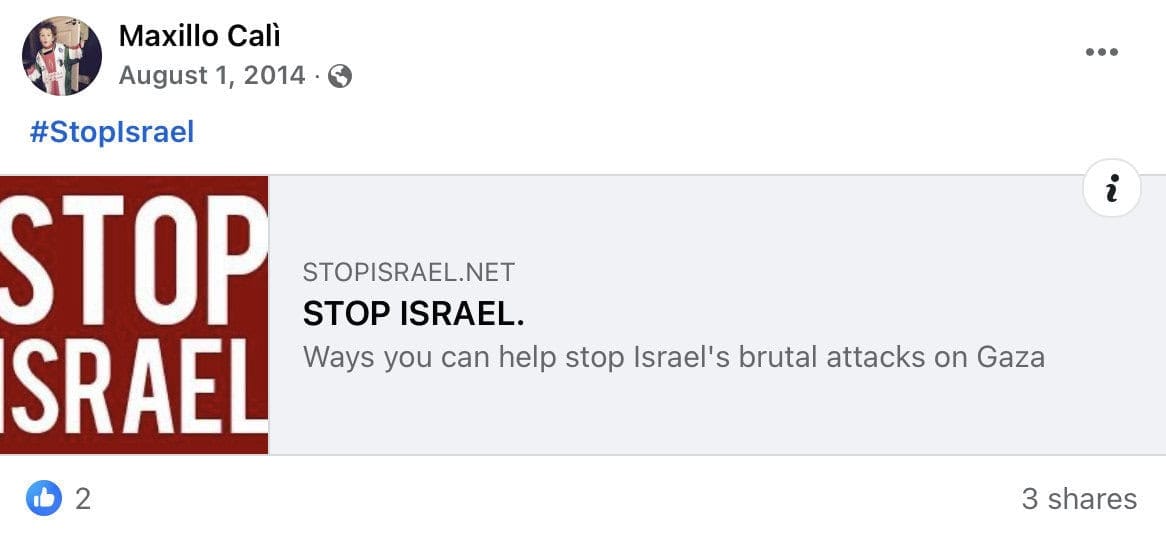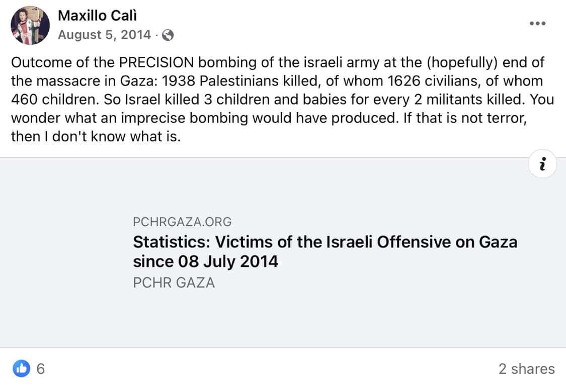Calì regularly posts incitement to antisemitism and jihadi terrorism on Facebook, including comparing Israelis to Nazis, promoting boycott and sanctions against Israel, accusing the Jewish state of genocide and apartheid, and justifying Palestinian terrorism.