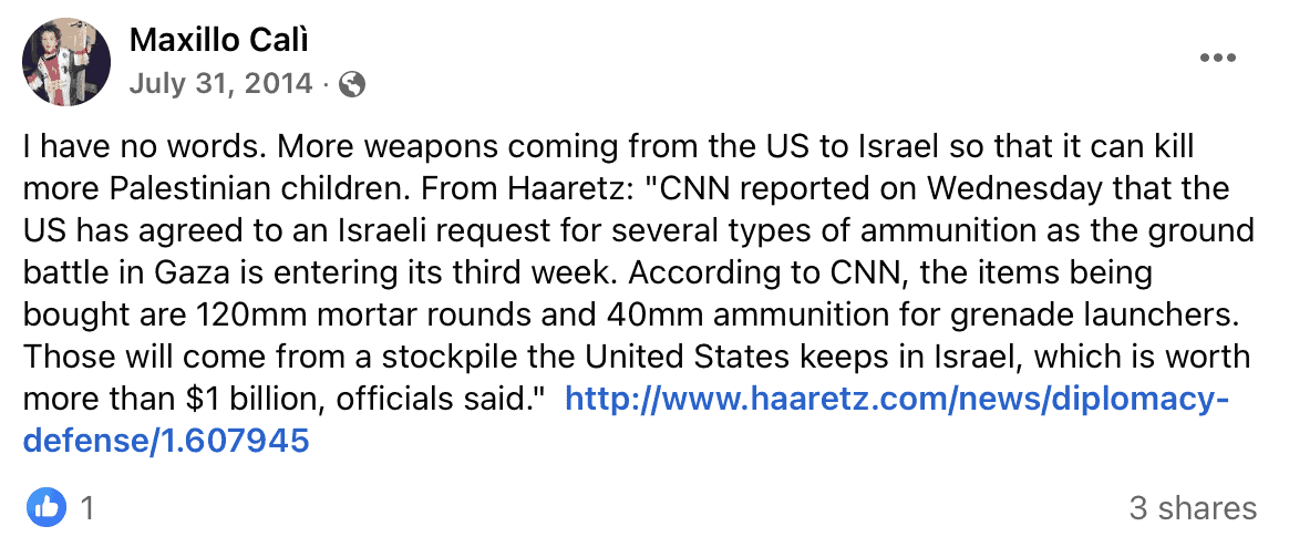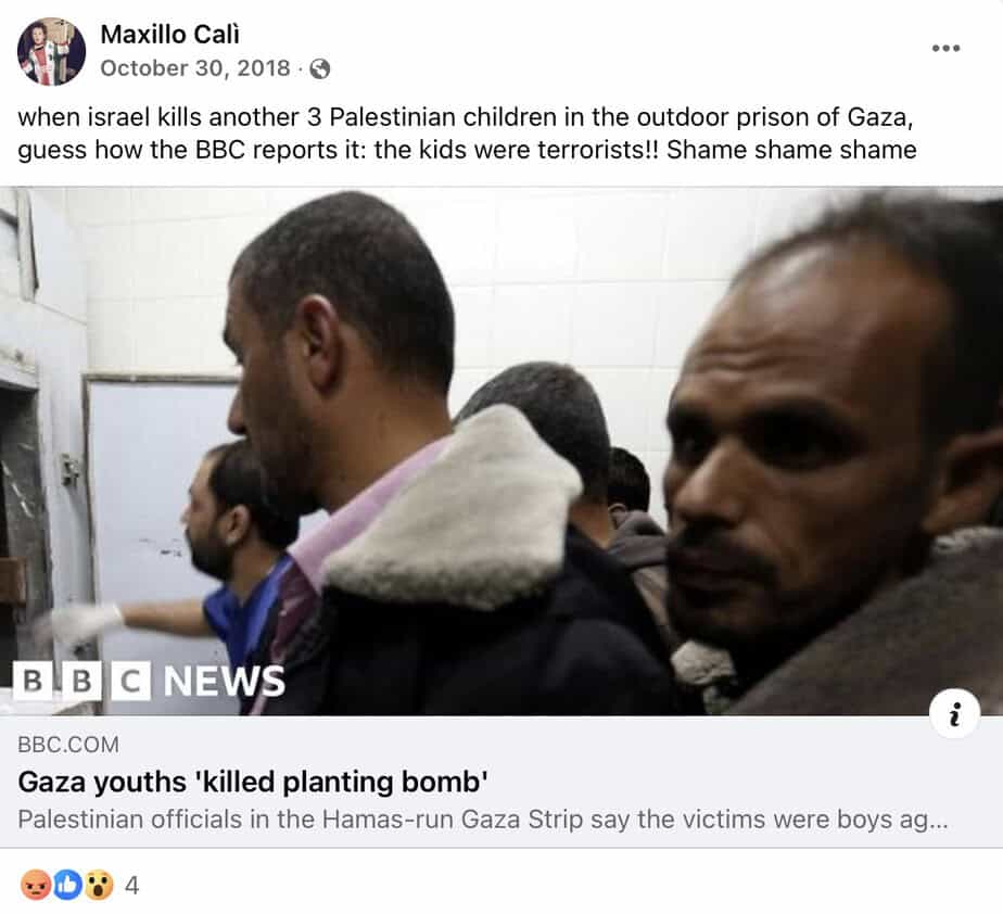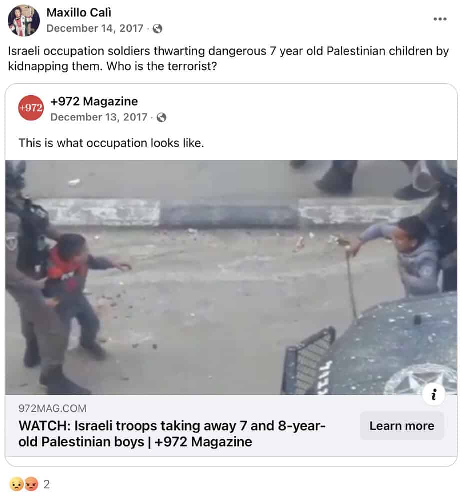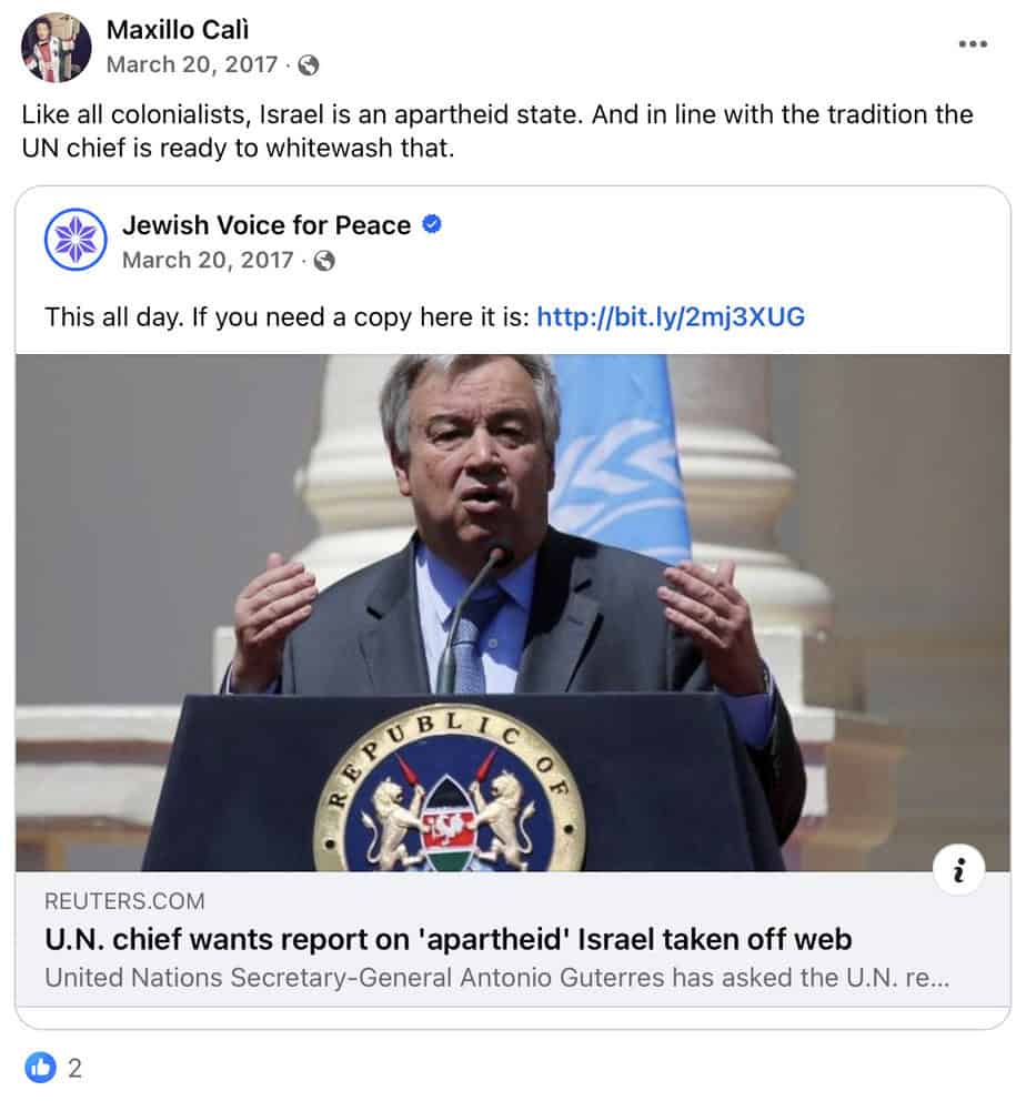 Calì regularly posts incitement to antisemitism and jihadi terrorism on Facebook, including comparing Israelis to Nazis, promoting boycott and sanctions against Israel, accusing the Jewish state of genocide and apartheid, and justifying Palestinian terrorism.