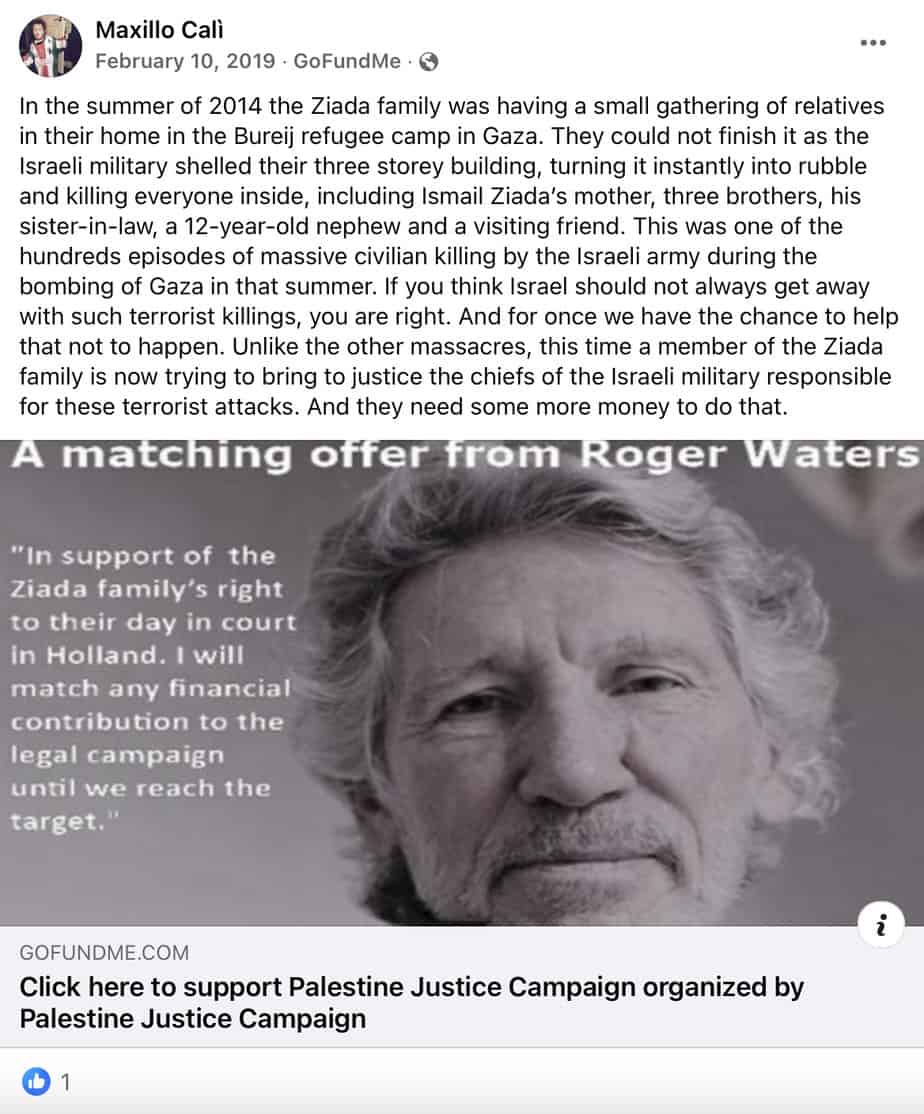 Cali accuses Israel of “terrorist killings” and “massacres” in its summer 2014 war against Hamas in Gaza in the context of sharing a GoFundMe campaign sponsored by antisemite Roger Waters to support a lawsuit against Israeli officials in a Dutch court. (February 10, 2019).