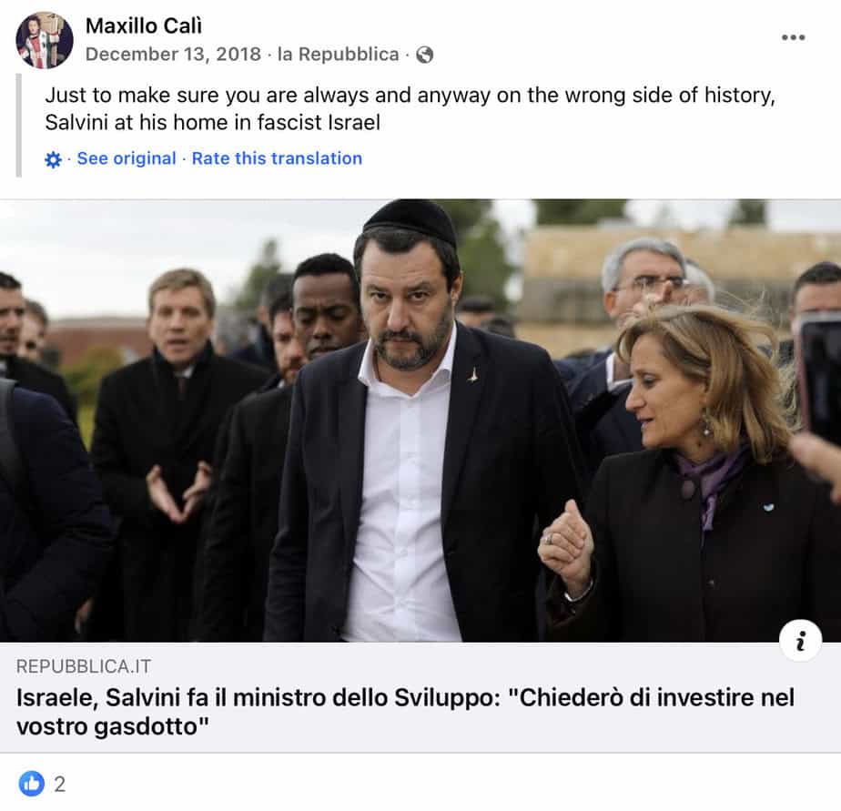 Accuses Italian Interior Minister Matteo Salvini of always being “on the wrong side of history,” and at home “in fascist Israel.” (December 13, 2018).