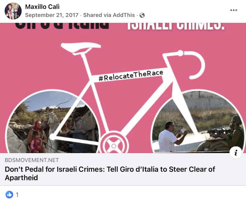 Shares a BDS post calling for Giro d’Italia bicycle race to “steer clear of apartheid” and not to hold race in Israel. (September 21, 2017).