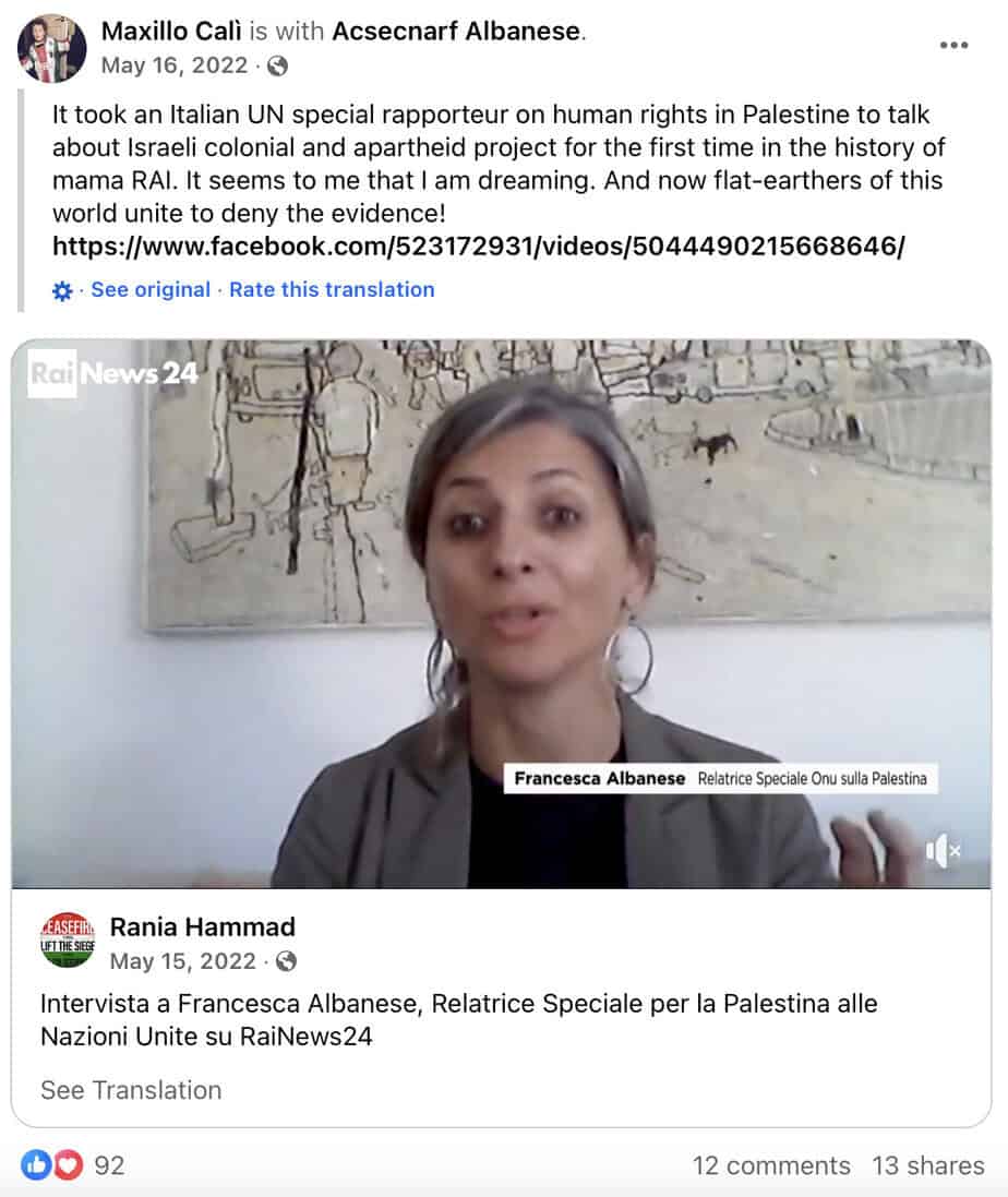 Cali shared his wife Francesca Albanese’s RAI News 24 interview in which she talks about the “Israeli colonial and apartheid project.” He called opponents of his wife’s claims “Flat-Earthers” (May 16, 2022).