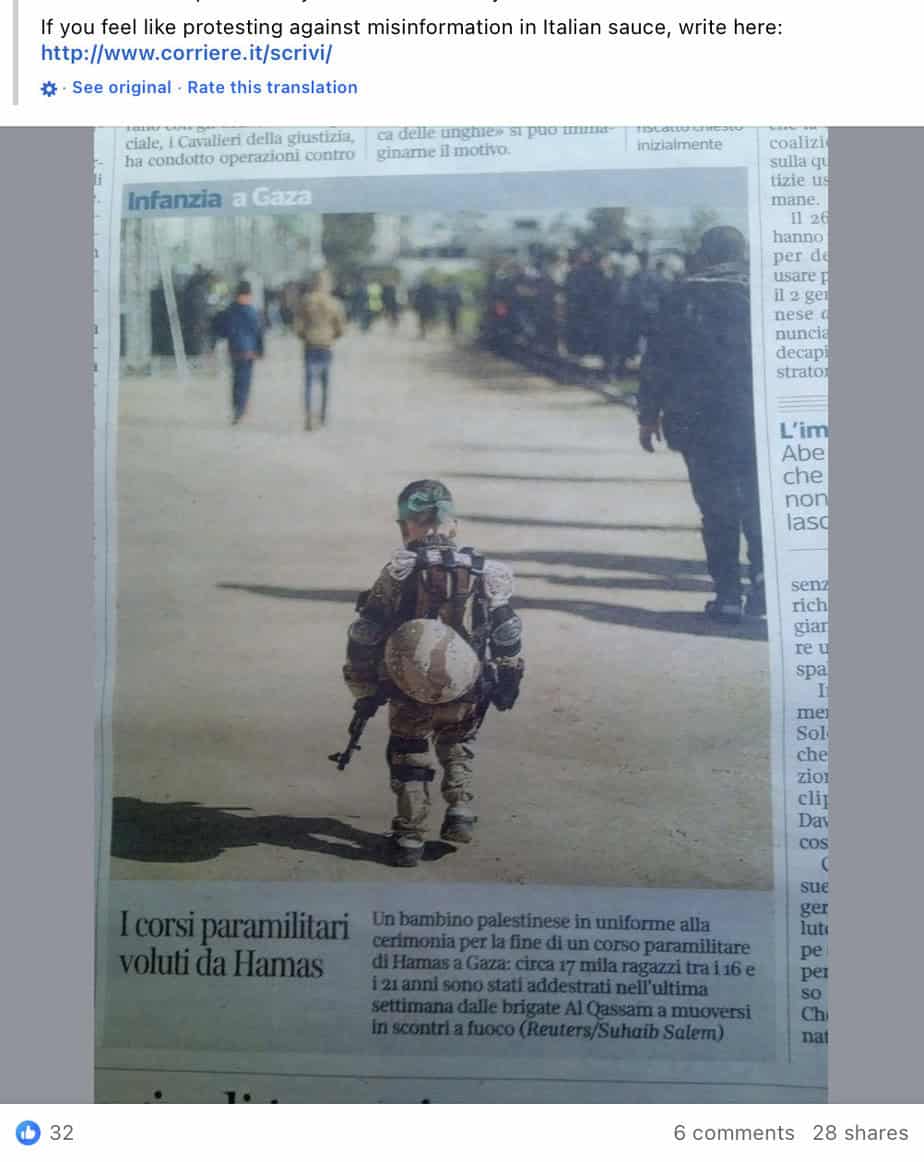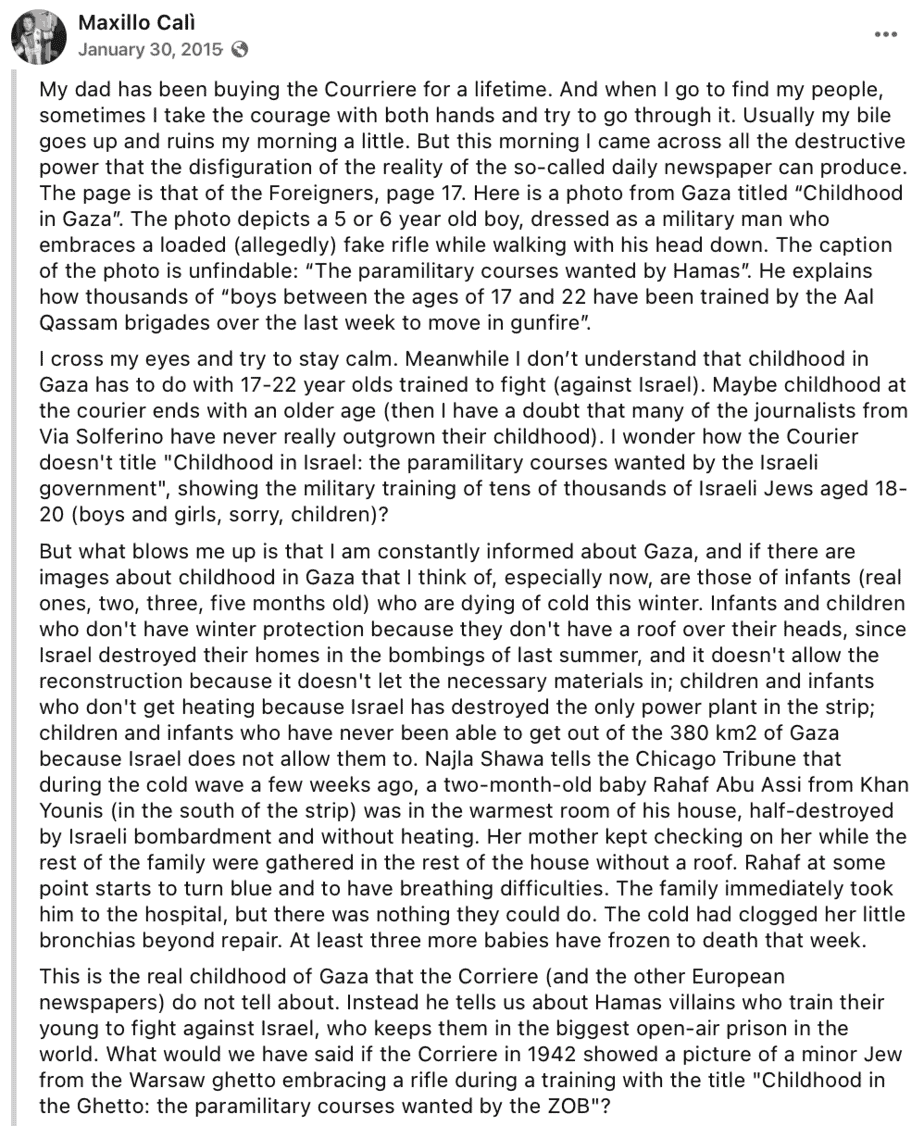 In a post tagging his wife Albanese, an enraged Cali justifies Hamas indoctrination of Palestinian children to terrorism. He equates a “Jewish minor from the Warsaw Ghetto” to young Palestinian boy “dressed as a military man, clumsily holding a (presumably) fake rifle.” Cali describes his fury and rage—”blowing up”—that the newspaper showed a photo of how Hamas dressed up children as terrorists. In a comment endorsing the post in which she is tagged, Albanese shares his rage, encouraging people to complain to the newspaper. (January 30, 2015).