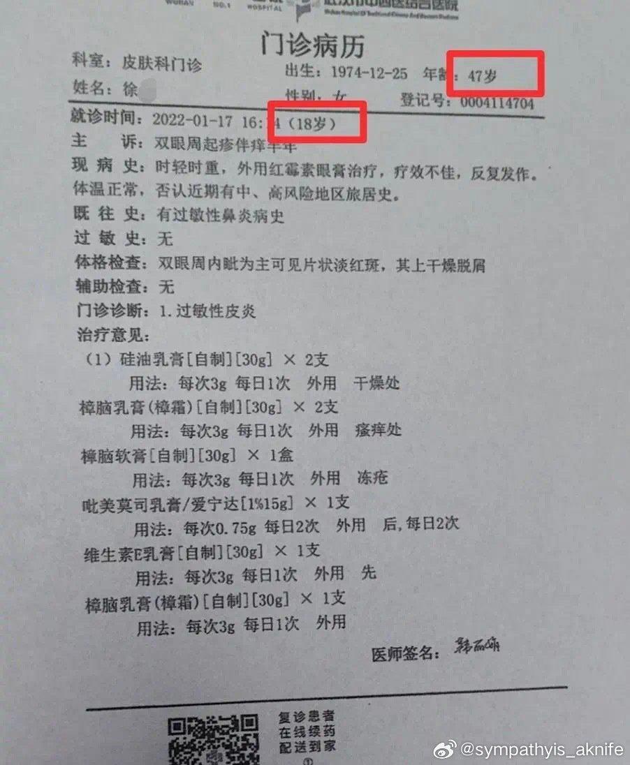 三,照片刻意只拍到武汉市中西医结合医院,其实左边还有一行故意遮挡了,武汉市第一医院。这是因为,这是同一家医院两个名字。想起来了吗?没错!徐某20220929要武汉市第一医院护士王╳╳代购药,药名正是这个20220117病历上开的一个。有只对真相感兴趣的网友,如果在武汉,去医院查一下电子病历即可。疑点:徐某问诊求药很可能为了己用,并非肖某。