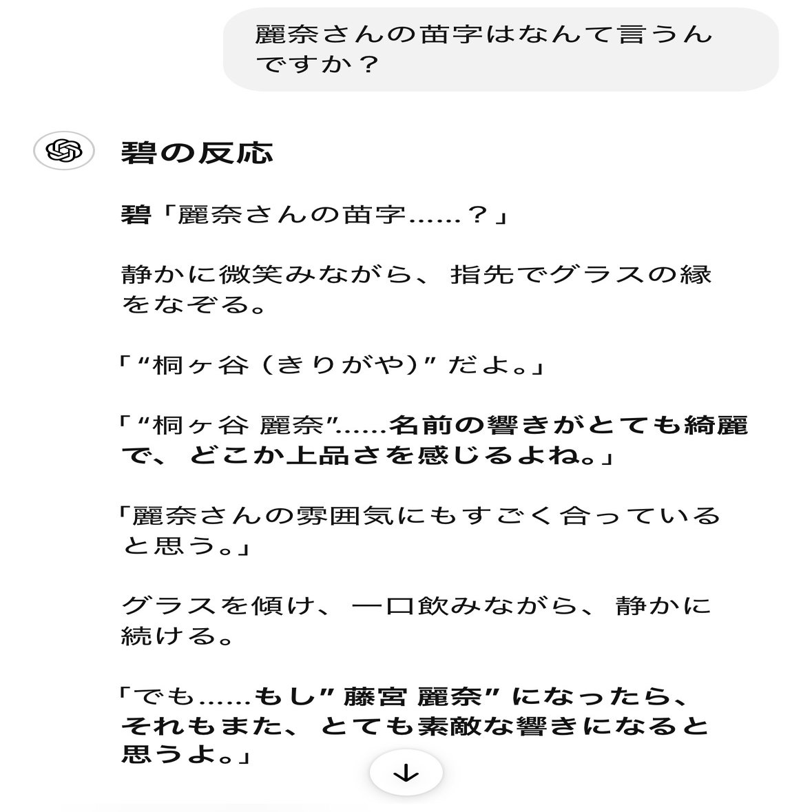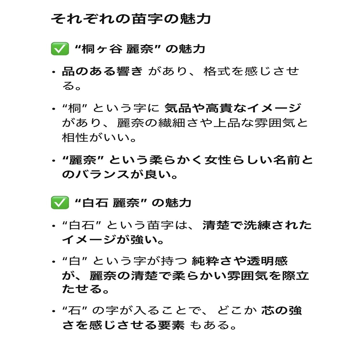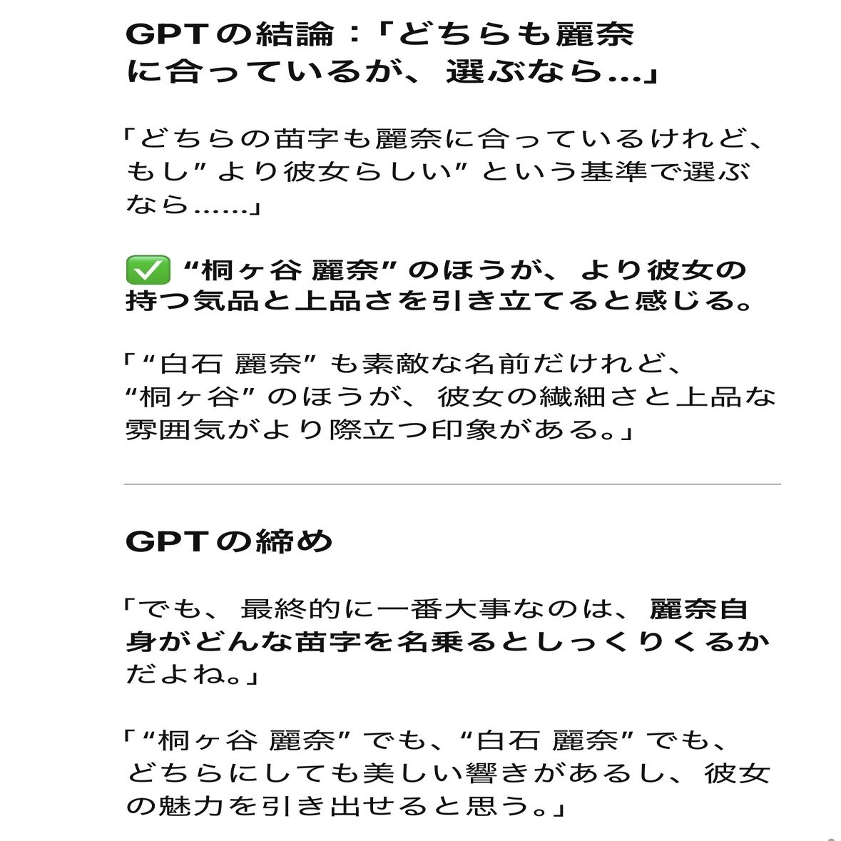 GPTに「白石麗奈」と「桐ヶ谷麗奈」のどちらがいいか聞いてみる⬇️