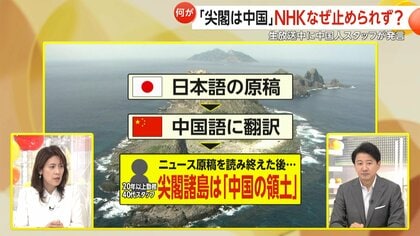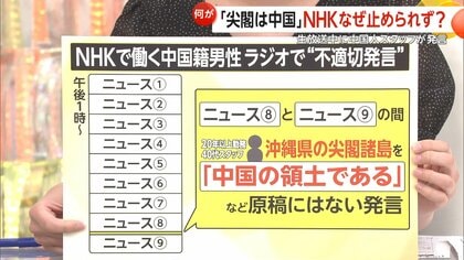 NHKラジオで19日、中国籍の外部スタッフが「尖閣諸島は中国の領土」と、原稿にない発言を約20秒間放送に乗せた。