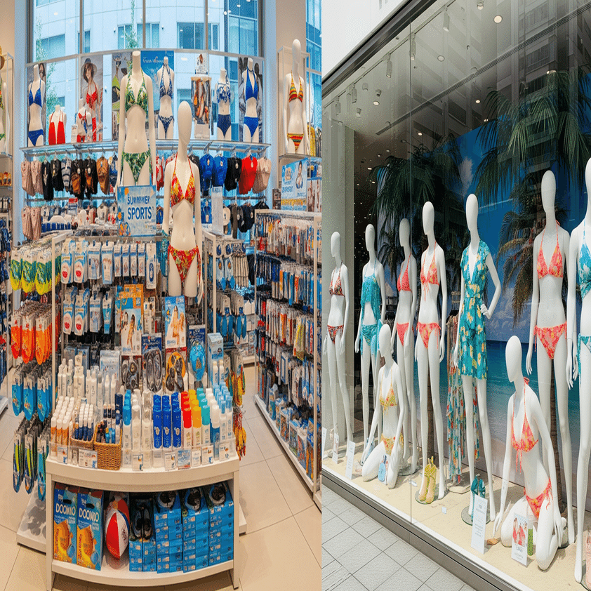 西口公園側のショウウィンドウのマネキンはカラフルなビキニに衣替え。