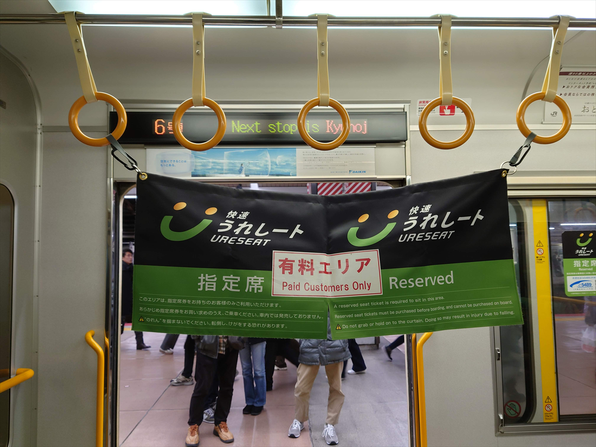 そのため、「うれしート」と知らずに乗った乗客は、車掌の案内で前方の自由席エリアに動いていくわけですが、そこはラッシュ時間帯であることに加え、短い6両編成でもあることが災いし、大混雑の自由席エリアに移らずに、「うれしート」エリアに立ち続けるお客さんもいました。