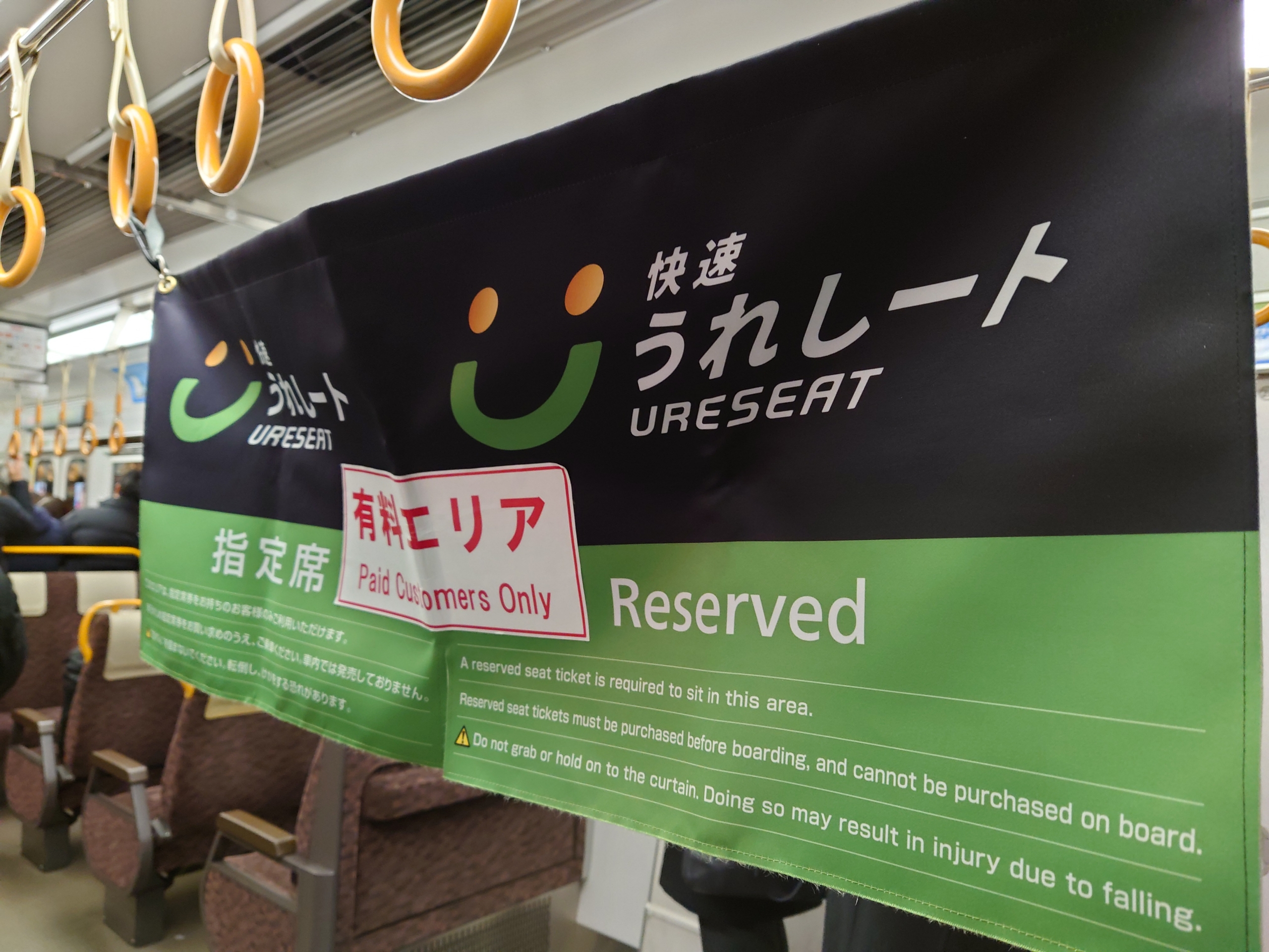 ▲乗車口には「うれしート」の「のれん」が掛けられており、何も知らない乗客でも「ここから乗るためには別途料金が必要」ということが分かるようになっています。
