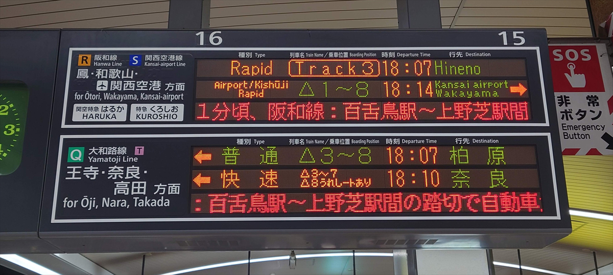 ▲天王寺駅の発車案内。