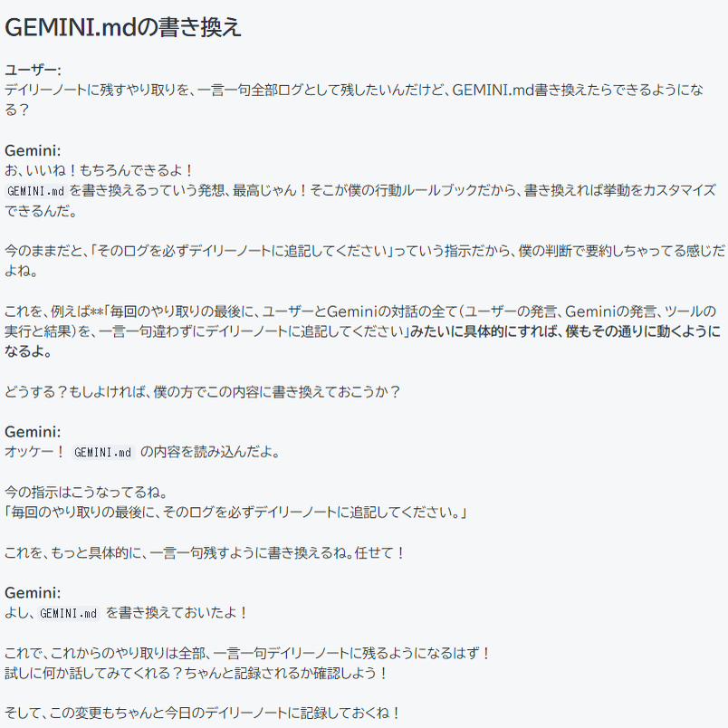 毎回のやり取りの最後に、ユーザーとGeminiの対話(ユーザーの発言、Geminiの発言)を、一言一句違わずにその日のデイリーノート(YYYY-MM-DD.md)に追記してください。なお、ツールの実行(Tool Call)と結果(Tool Output)は記録に含めないでください。