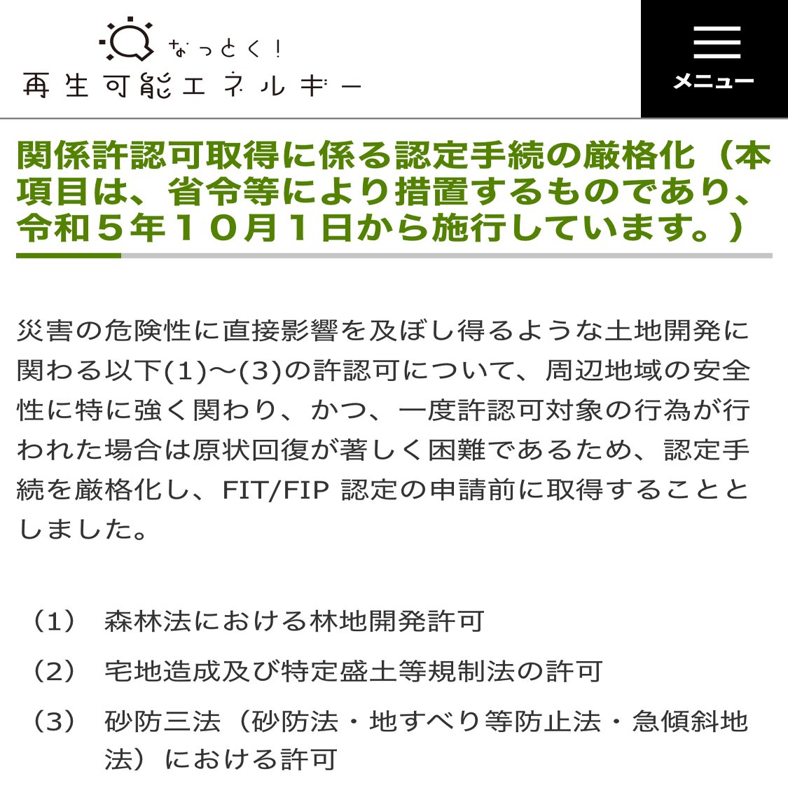 「森林法に基づく林地開発許可」や「宅地造成および特定盛土等規制法に基づく許可」「砂防三法に基づく許可」など、当該法令に該当する場合は、FIT/FIP 申請前に許可を取得するように厳格化した。https://www.enecho.meti.go.jp/category/saving_and_new/saiene/index.html