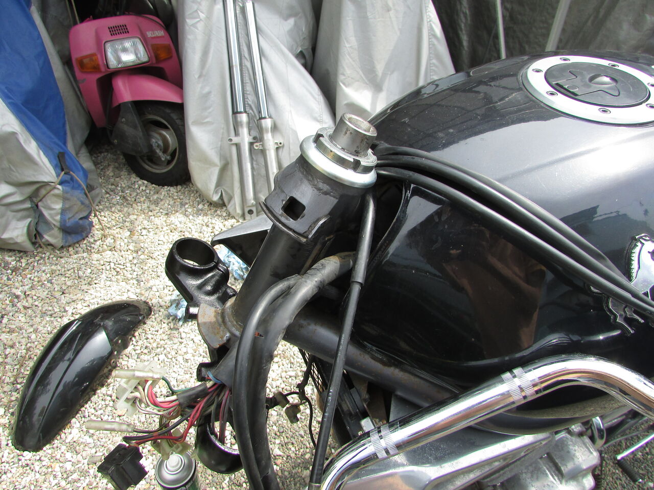 ステムをやるにはフロントを完全に取り外さなければならないので、考えた結果こんな感じで作業することに。