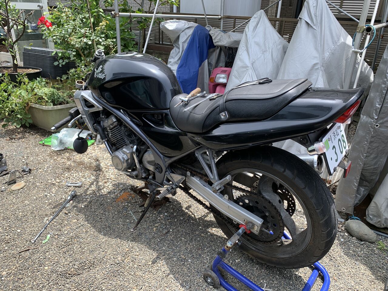 F周りの分解整備、最大の課題はやはり「どうやって前輪を浮かせるか」ですよね。