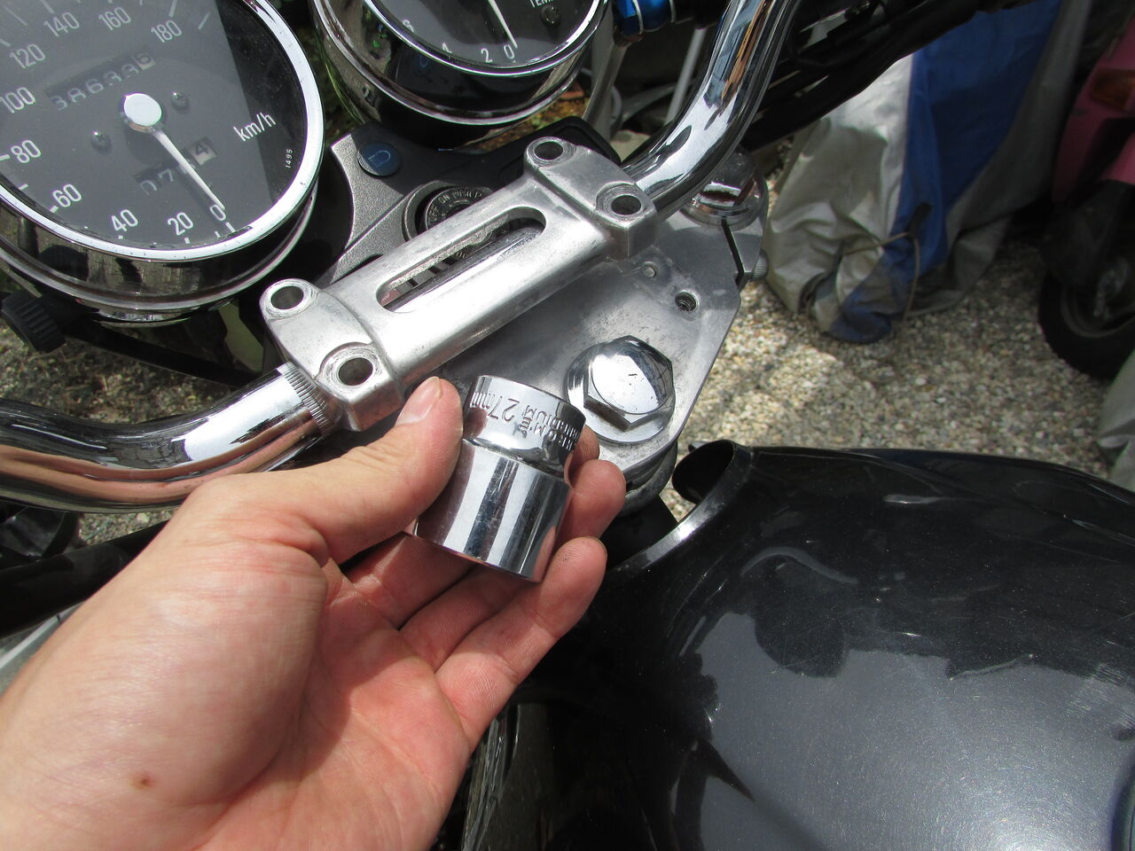 トップブリッジのボルトは27mmのレンチで外せました。結構固く締まってましたね。