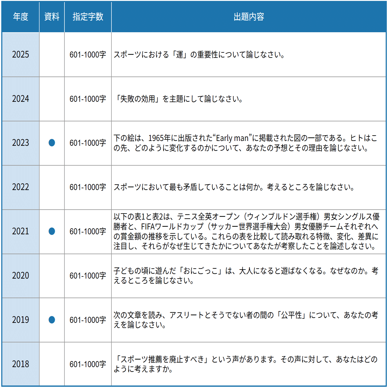 スポーツにおける「運」の重要性(2025)、「失敗の効用」(2024)など抽象的かつスポーツに関連したテーマについて意見論述する問題。