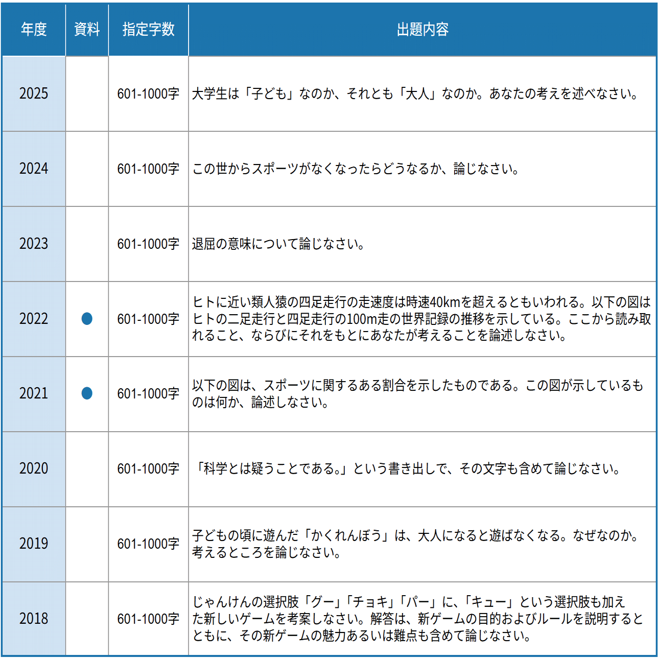また、総合型選抜Ⅲ群(スポーツ自己推薦入試)の出題傾向は、「一般選抜(共テ+総合問題)」の小論文とほぼ同一です。したがって、一般選抜の過去問も対策に活用できます。