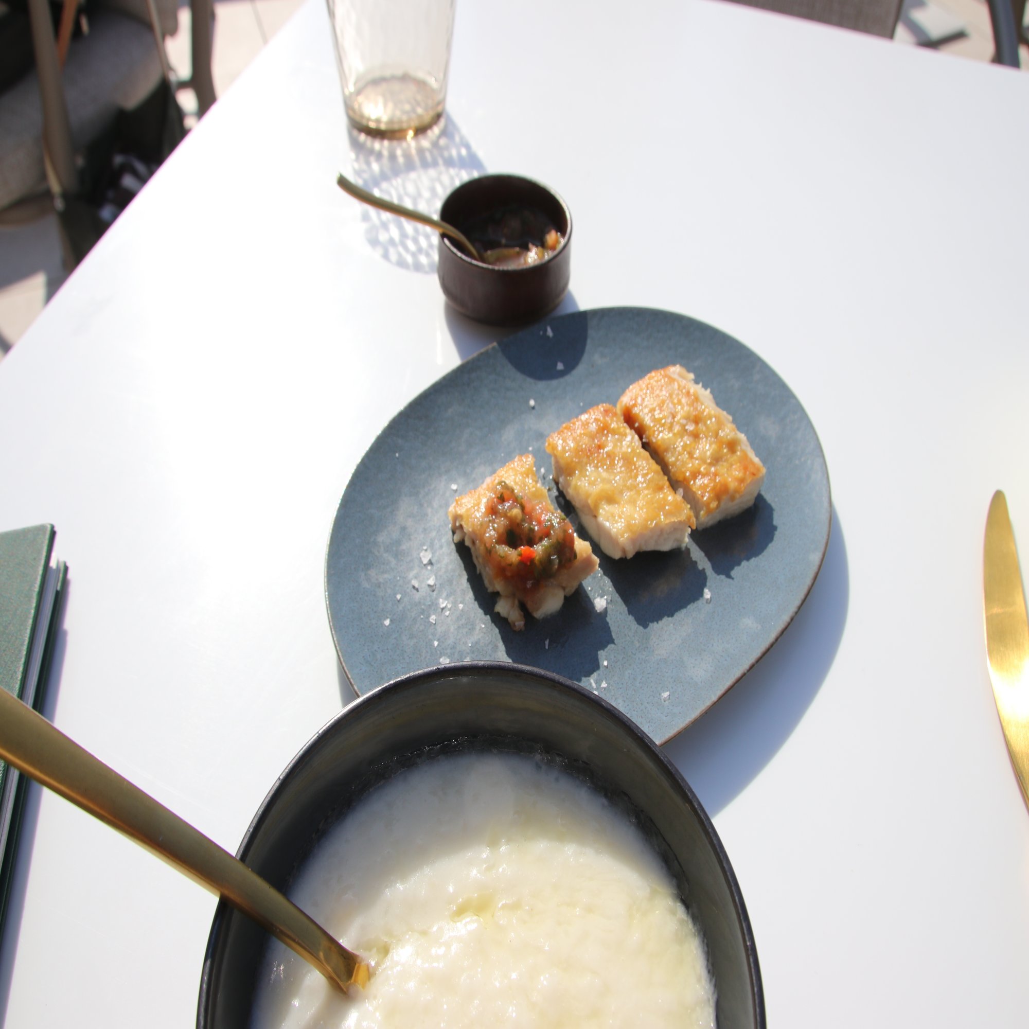 Matfi Fish(マタフィ・フィッシュ)、価格1200円:真空調理した魚にタマリンドとコリアンダーのソースをかけ、ルッコラと玉ねぎのサラダを添える