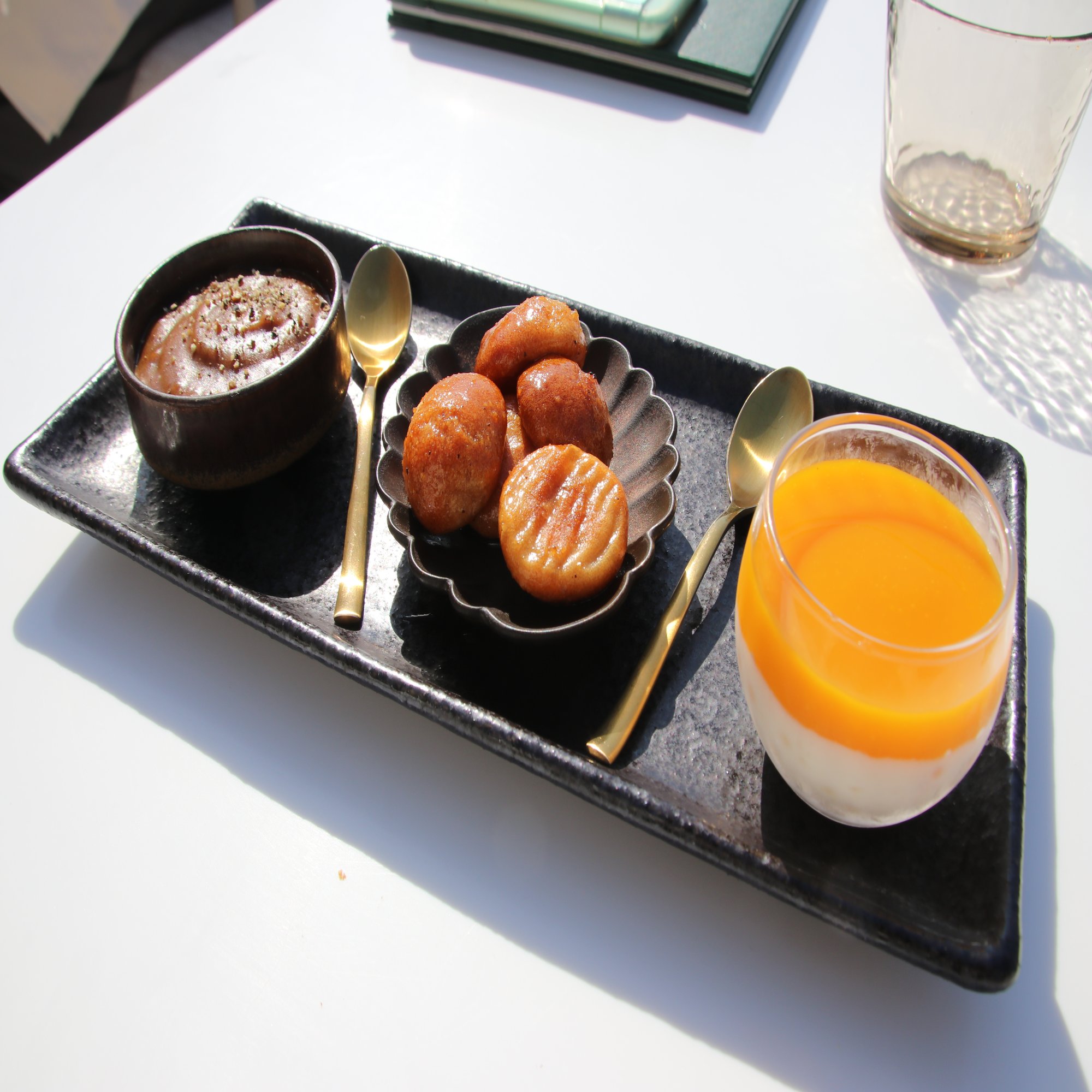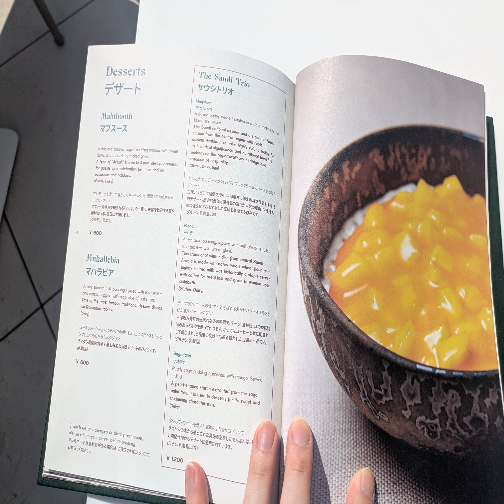 The Saudi Trio(サウジトリオ)、価格1200円:MaqShush(マクシュシュ、焼いた大麦にデーツのシロップとブラックライムのソースをかけたデザート)、Mohalla(モハラ、デーツのクッキーをのせ、ギーというバターオイルをかけたプリン)、Sagodana(サゴタナ、マンゴープリン)の3種類の盛り合わせ