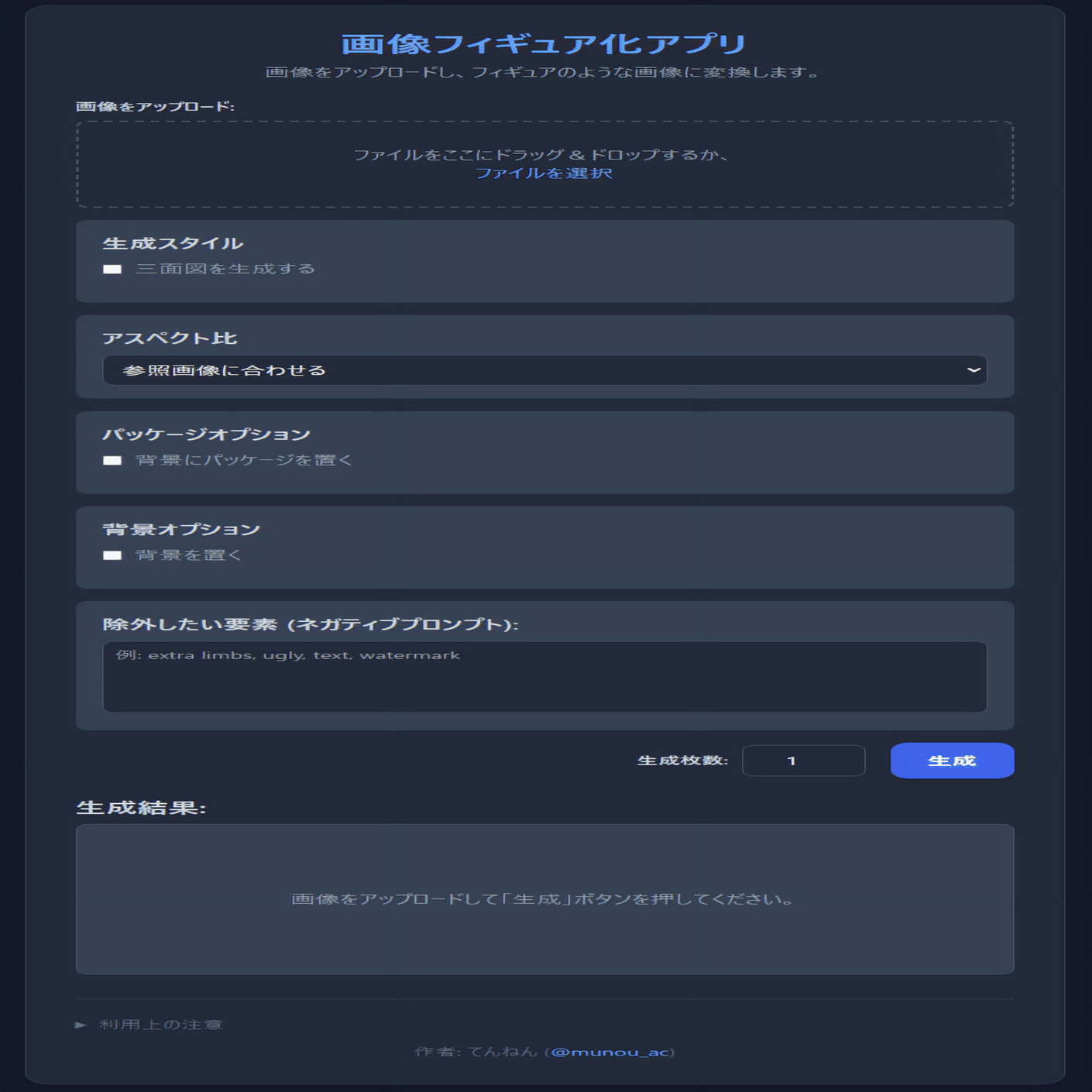 以下で説明するオプションを何も選択しない場合は、このまま生成ボタンを押すとフィギュア化されたキャラクターのみの画像が生成されます。