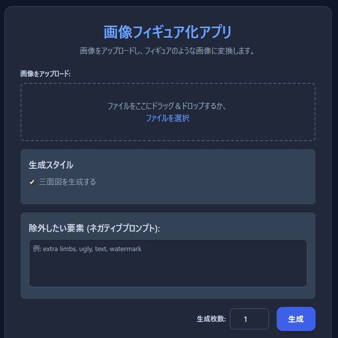 いまのところNano Bananaはフィギュア化にしか使っていないので、いっそのことイラストフィギュア化専用アプリとして作ることにしました。