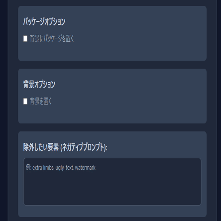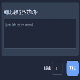 ネガティブプロンプトの入力欄を追加しました。わたしはあまり使わないのですが、どうしても余計なものが出てきがちなモチーフのときにあると便利かと思い、とりあえず追加しました。Nano Bananaでどれくらいネガティブプロンプトが効くのかわからないですし、ChatGPTやGrokの経験からここに指示したタグが誘因になってかえってそのものが出てくることが多いような気がしています。