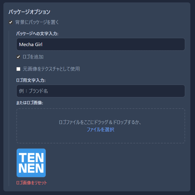 ロゴの位置も「左上・右上・左下・右下」から選択できるようにしてみたのですが、反映はされるもののパッケージの外や、画像そのものの選択した位置に描かれることが高確率であるのでやめました。あとは、一回生成した後で、座標で描く位置を指定することもおそらくできますが、UI作るのが面倒なのとそこまでしてもな、と思ったので実装していません。たぶん、できます。