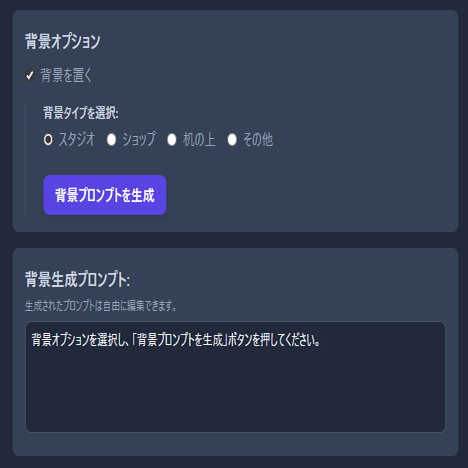 「背景タイプを選択」から任意のキーワードをラジオボタンで選択します。その後、「背景プロンプトを生成」ボタンを押すと、下段の「背景生成プロンプト」に選択したキーワードに沿ったプロンプトが表示されます。