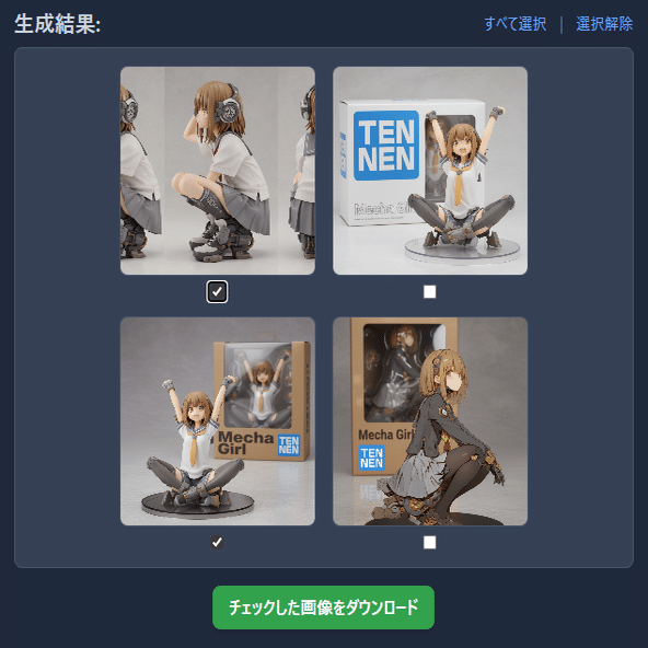こんな具合に生成画像がサムネイル表示されます。画像クリックでモーダルウィンドウが開いて拡大表示できます。そして、各サムネイル下のチェックボックスをオンにして、「チェックした画像をダウンロード」を押すとまとめてダウンロードできます。めちゃくちゃ便利!