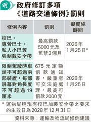 【明報專訊】巴士乘客要留意,政府正式提出修訂《道路交通條例》,將現行強制安裝及配用安全帶的法定要求延伸至巴士、校巴等,明年1月25日實施後,若所乘車輛裝有安全帶便要佩戴,否則面臨最高5000元罰款及3個月監禁。另外,當局亦規管司機車頭不能放置超過兩部流動電訊裝置,每部尺寸限對角長不超過19厘米(約7.5吋),違者罰款增至675元,以防的士司機多開程式瀏覽接單。