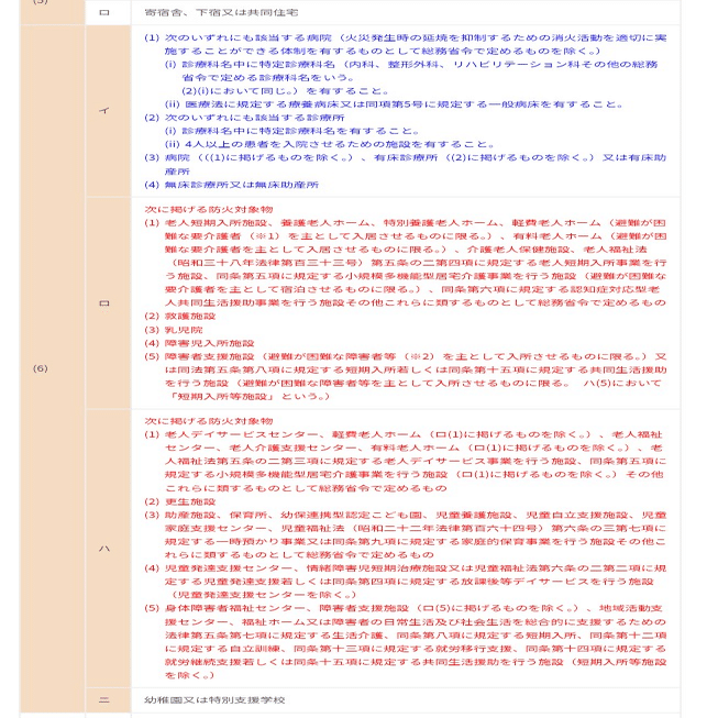 多くの病院については消防法(昭和二十三年法第百八十六号)に基づき、特定防火対象物に指定されています(消防法施行令別表第一より)。特に通常の精神科病棟においては、別表六項に該当する可能性が高く、スプリンクラー、自動火災報知設備(以下「自火報」という)、誘導灯、排煙設備などの設置が厳格に行われています。特に閉鎖病棟を併設する精神科閉鎖病棟については、その性質上、ほぼ必ず「避難が困難な人」が存在する為、建物ごと特定防火対象物に指定されているでしょう。