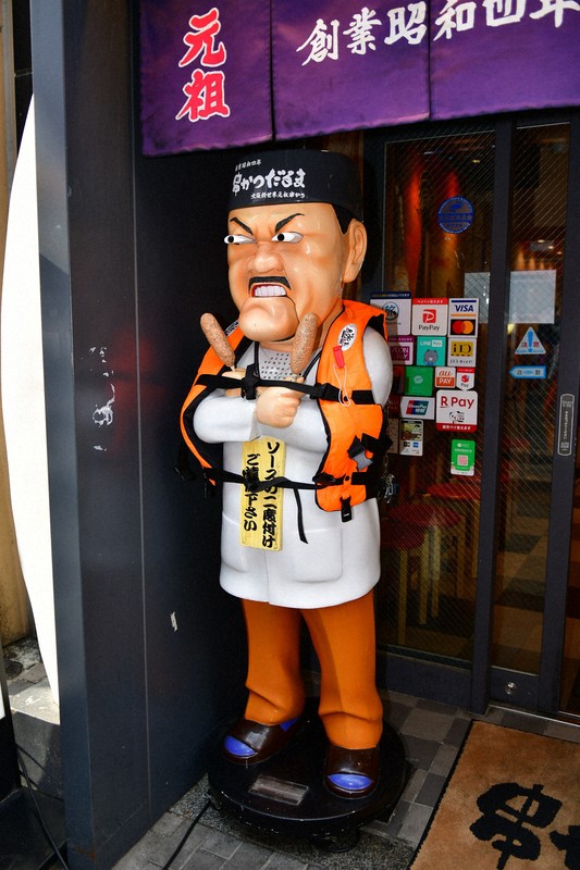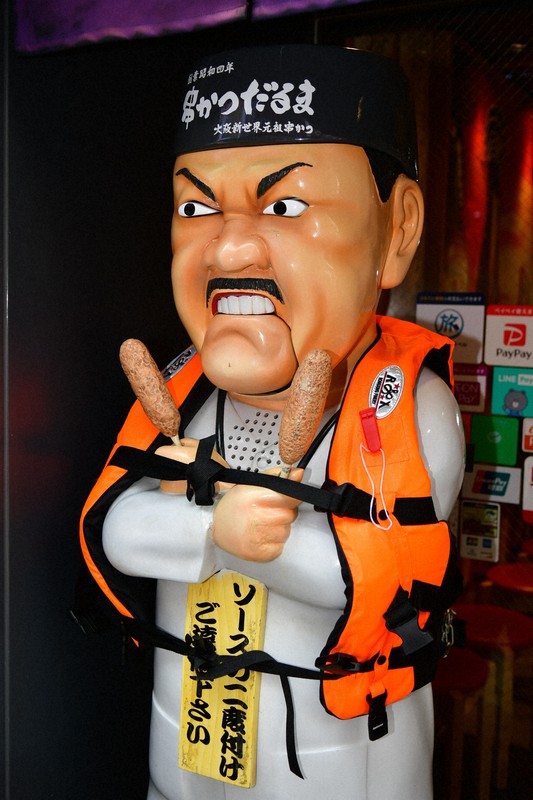 だるま大臣は、台座を合わせて高さ約180センチの樹脂製。目とあごが動き、「二度漬け禁止、ソースはかけて食べてや」と音声が流れる。