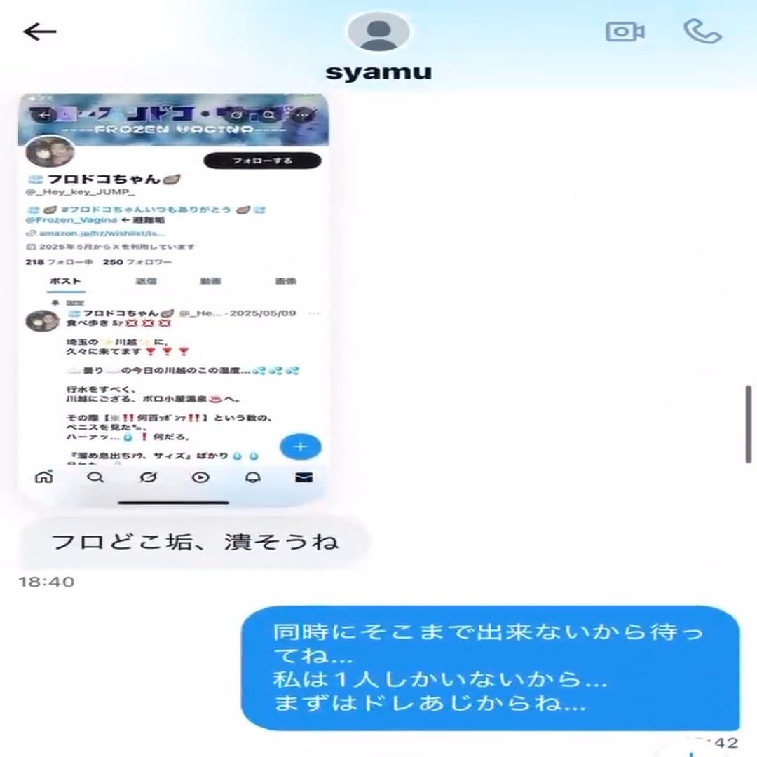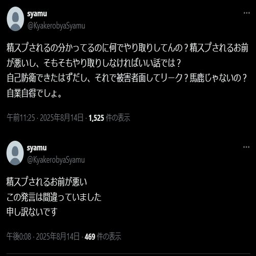 これだけでもひどいですが問題はここからで、syamuはそれを一方的に逆恨み。取り巻きに彼女を誹謗中傷するよう犬笛を吹き現在彼女のSNSに罵詈雑言を送るアカウントが2、3個粘着しています。