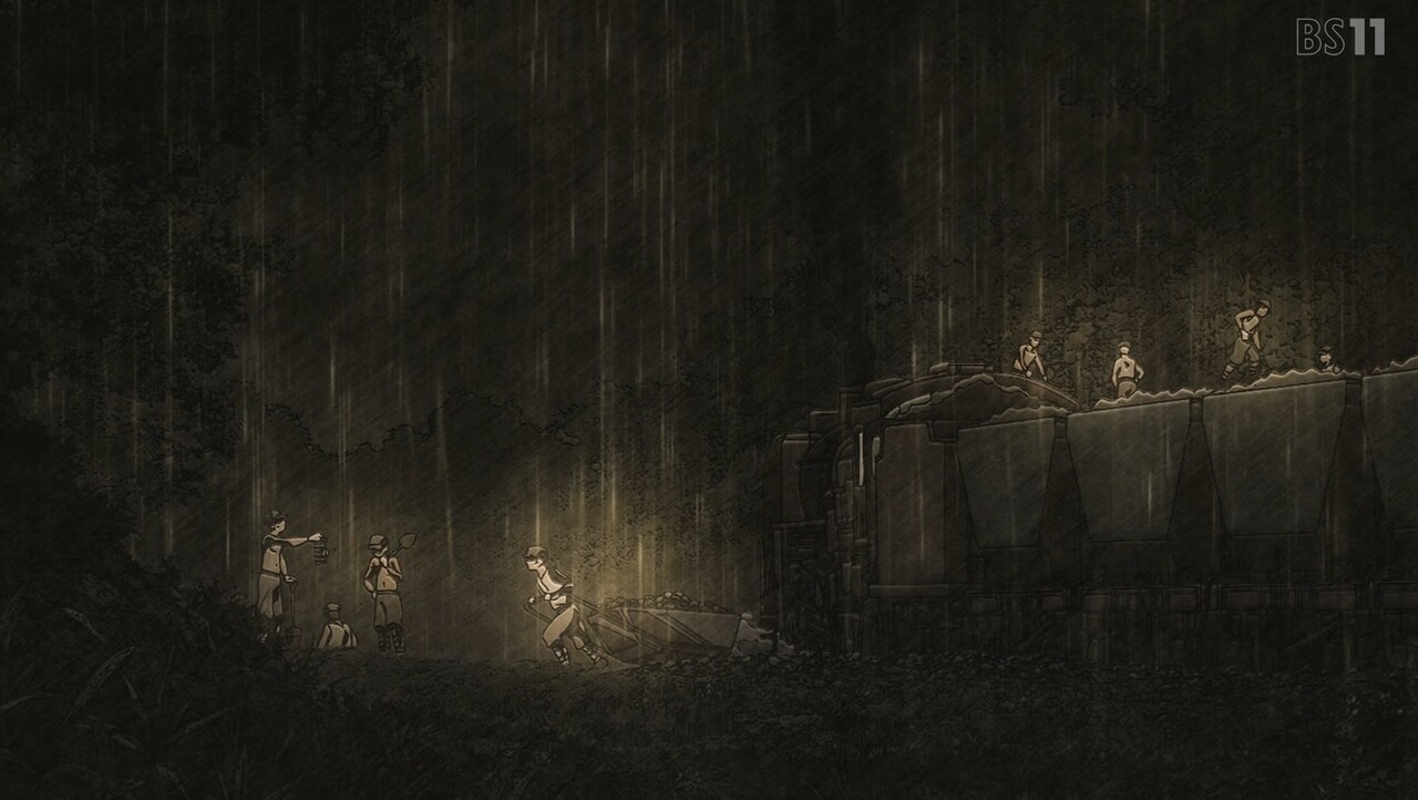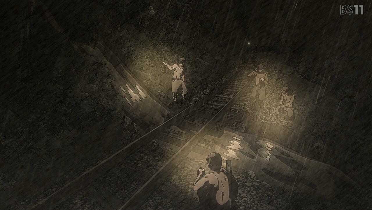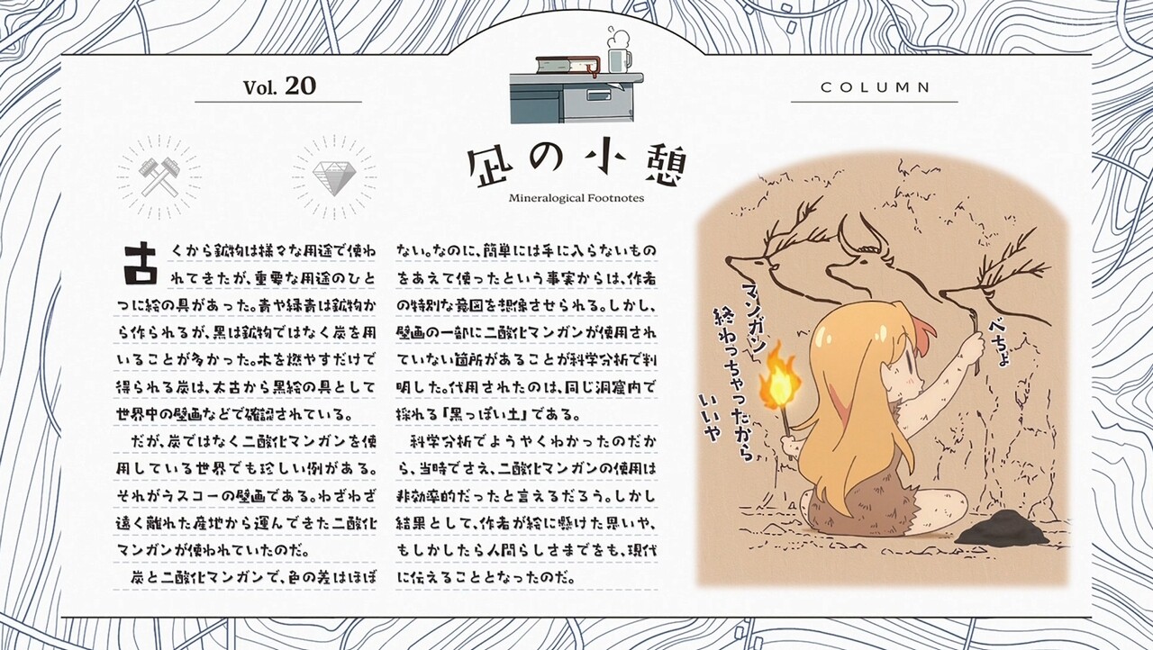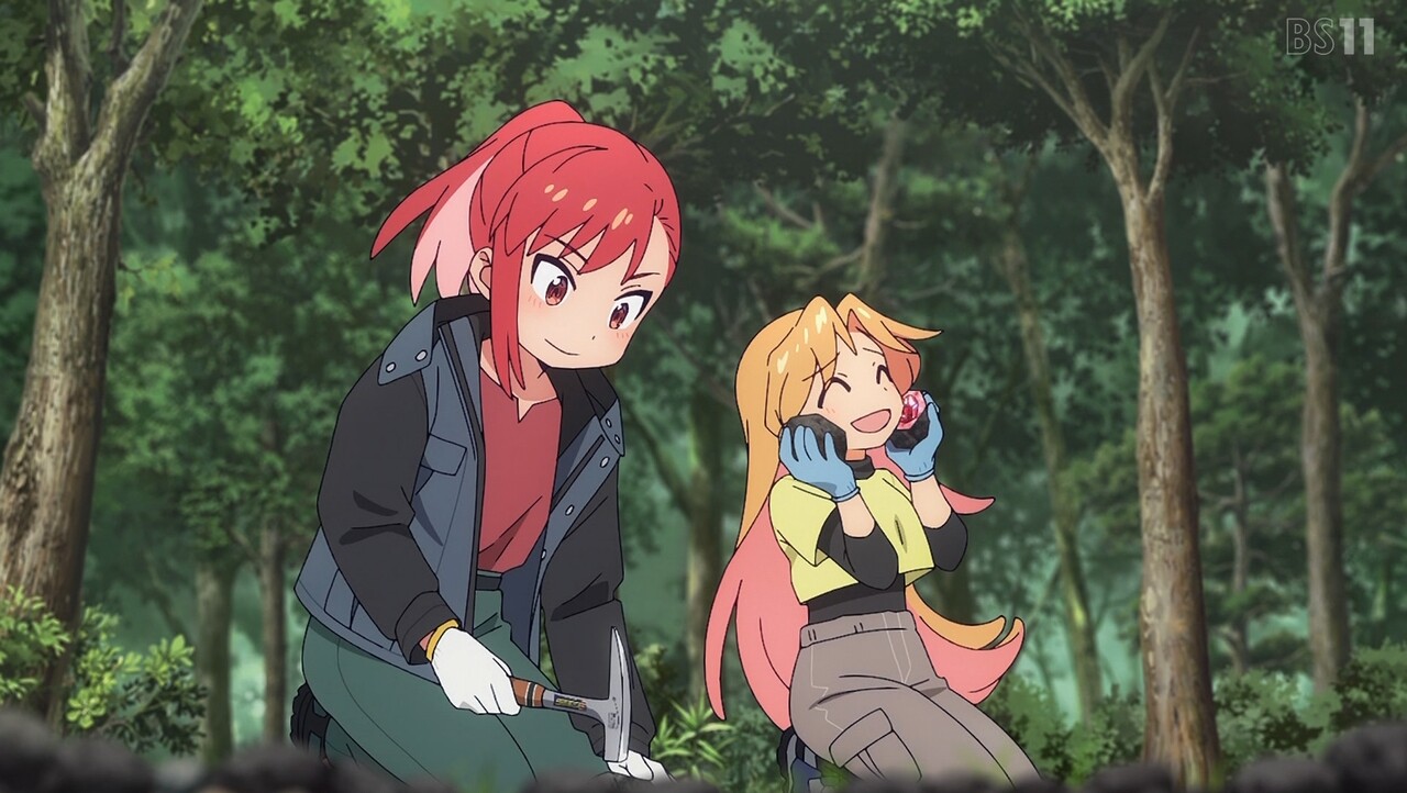 ルリと瀬戸を鉱山に連れていく伊万里。地図を見ながらなんとか鉱山に続く廃線を見つけた3人は、マンガン鉱石を発見する。その後トンネルに到着するも、天井が崩落し、その先がたどれなくなっていた。鉱山跡にたどり着くのが難しくなってしまった3人は、鉱石を積んだ汽車から落ちた石を探すことに。