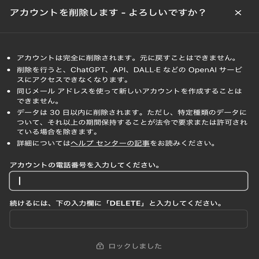 ChatGPT のアカウントが削除できない件「ロックしました」について(解決済)