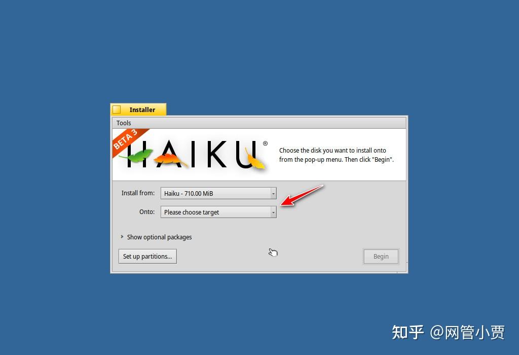 这个时候就可以选择刚才格式化好的磁盘了,点击 Begin 开始安装吧。
